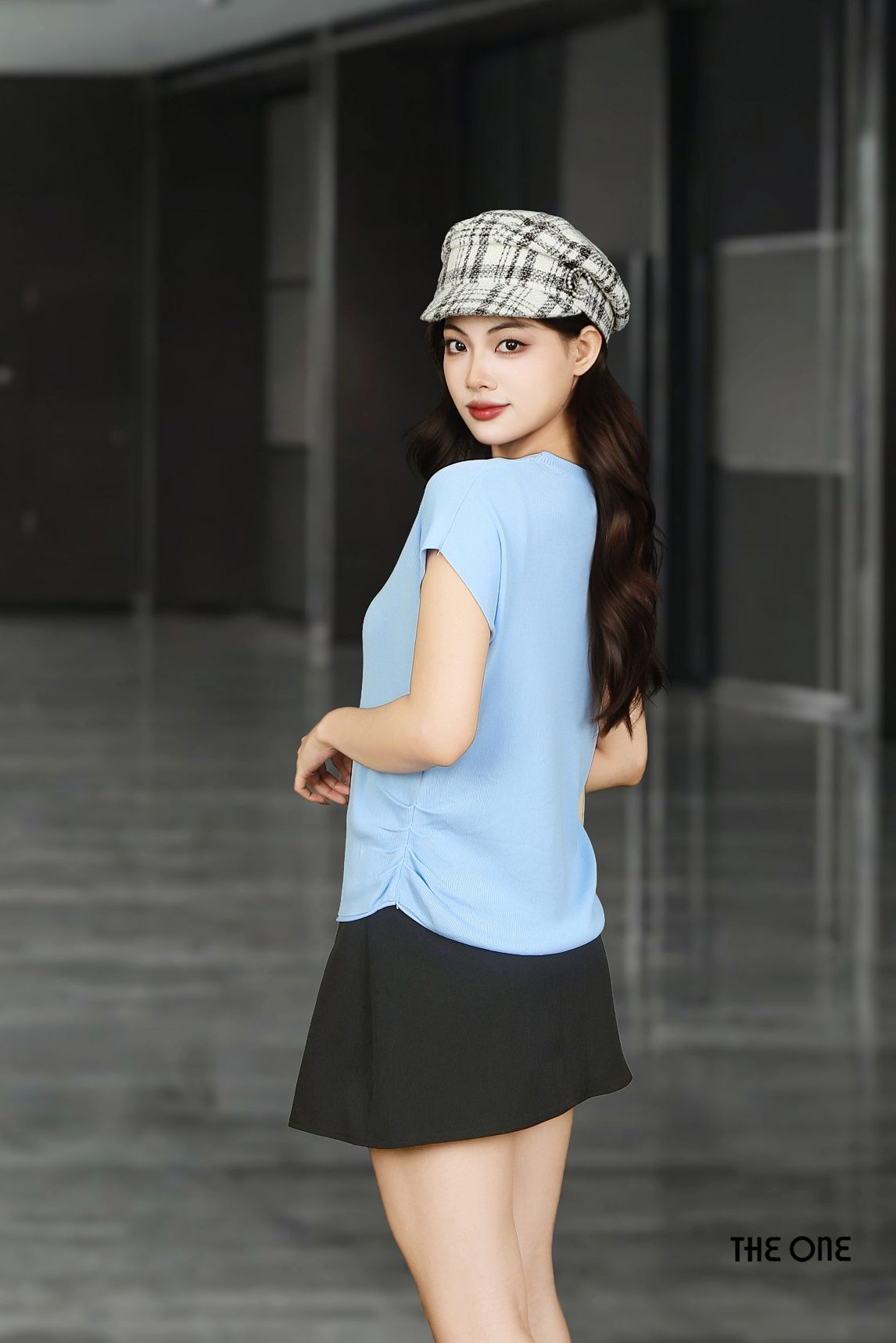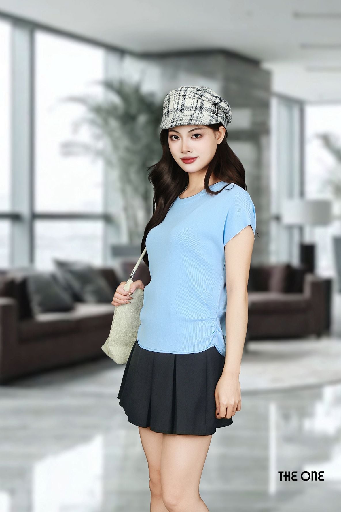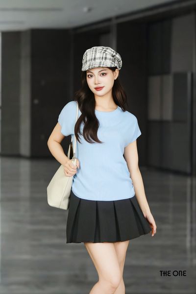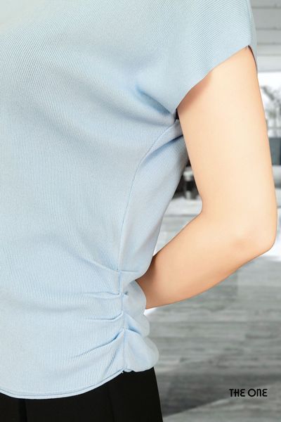 Áo len Mongtoghi xanh cổ tròn vai liền cộc chun 2 bên sườn