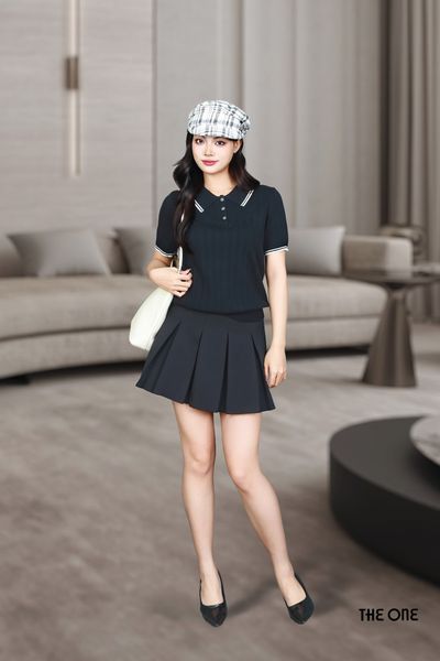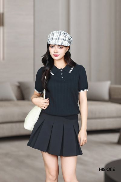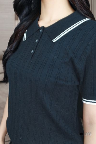 Áo len polo đen 3 khuy tay cộc bo gấu viền trắng cổ và tay