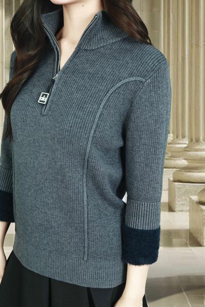 Áo len ghi đậm lót lông tay dài bo gấu cổ cao kéo khóa