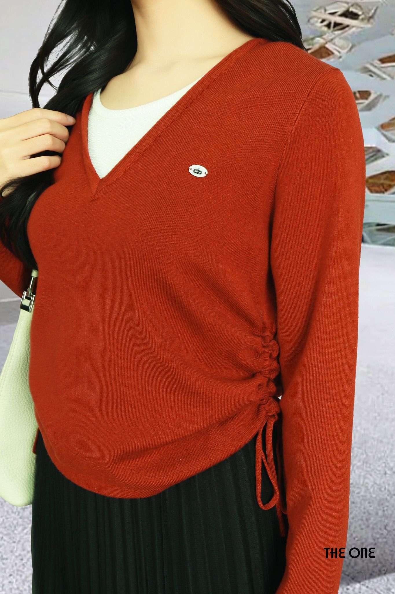 Áo len đỏ mận tay dài cổ V 2 lớp phối trắng dây rút 2 bên sườn