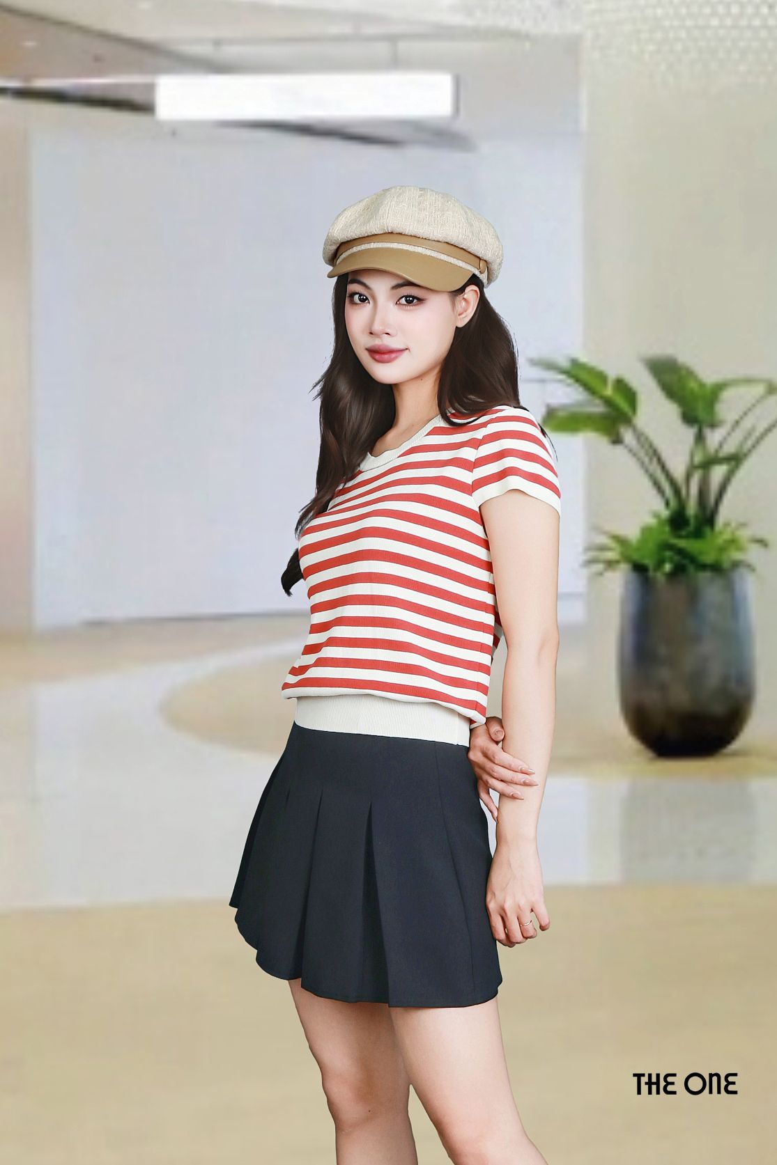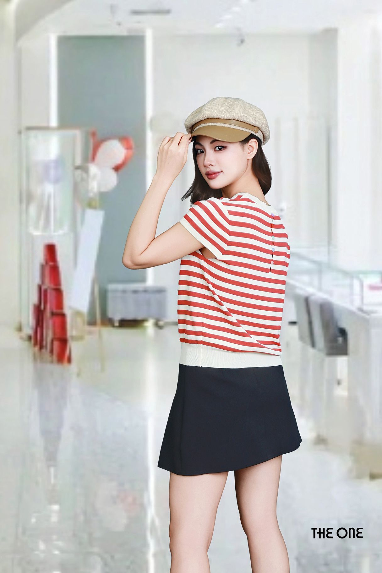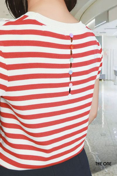 Áo len Mongtoghi kẻ trắng đỏ tay cộc cổ tròn khuy sau