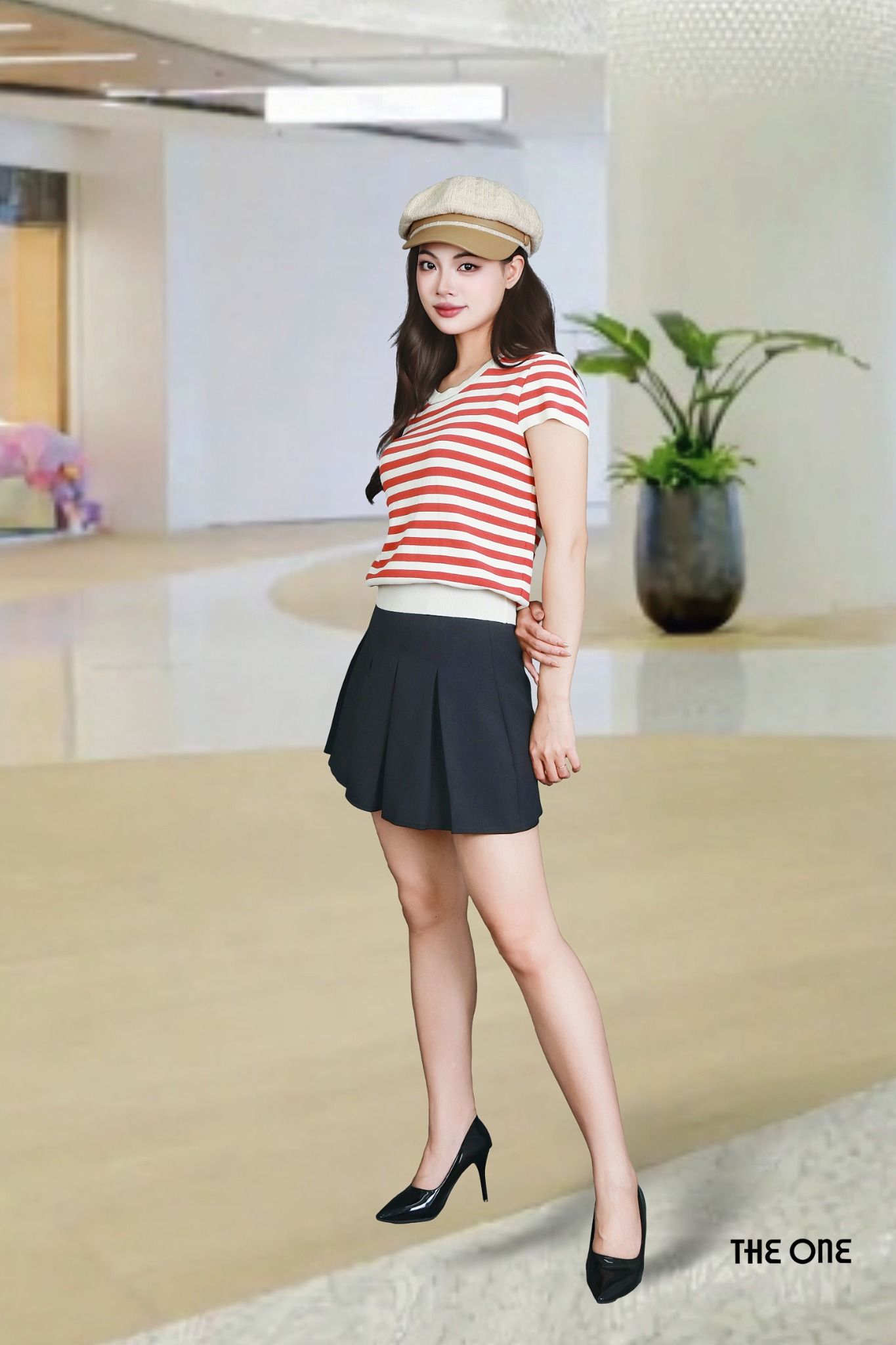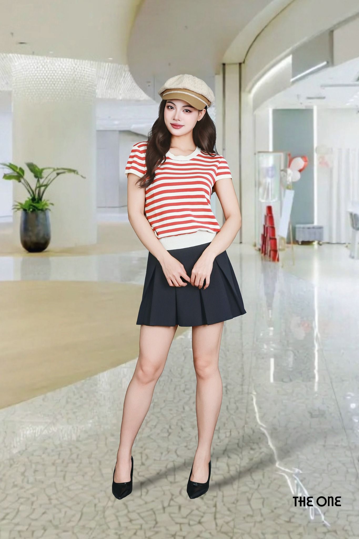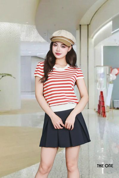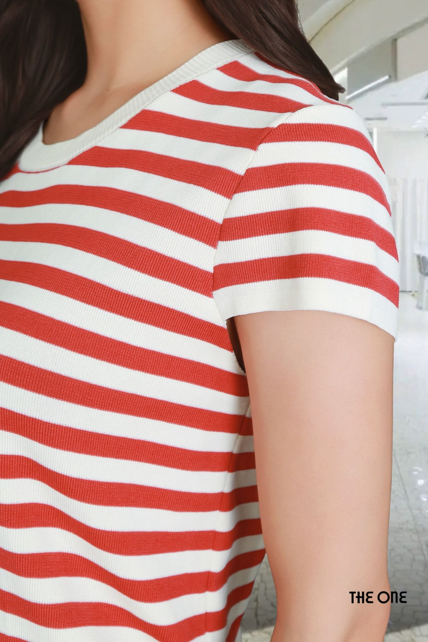 Áo len Mongtoghi kẻ trắng đỏ tay cộc cổ tròn khuy sau
