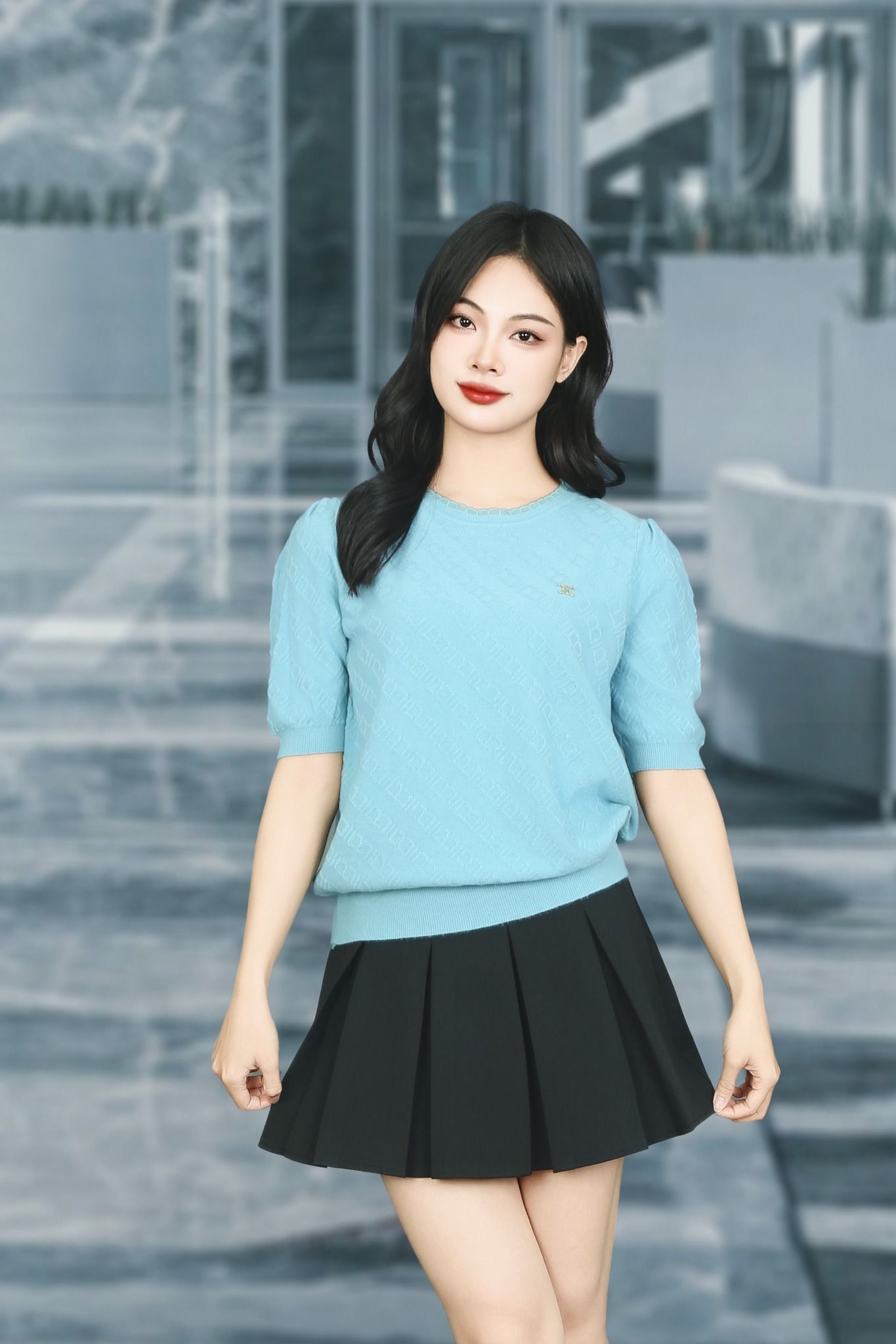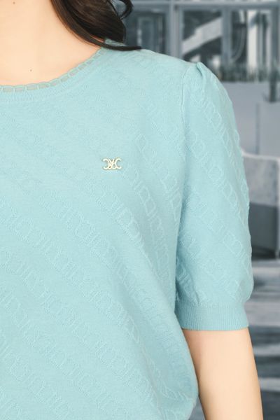 Áo len xanh tay lỡ cổ tròn viền ren nơ trang trí