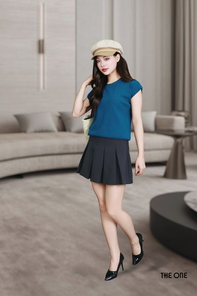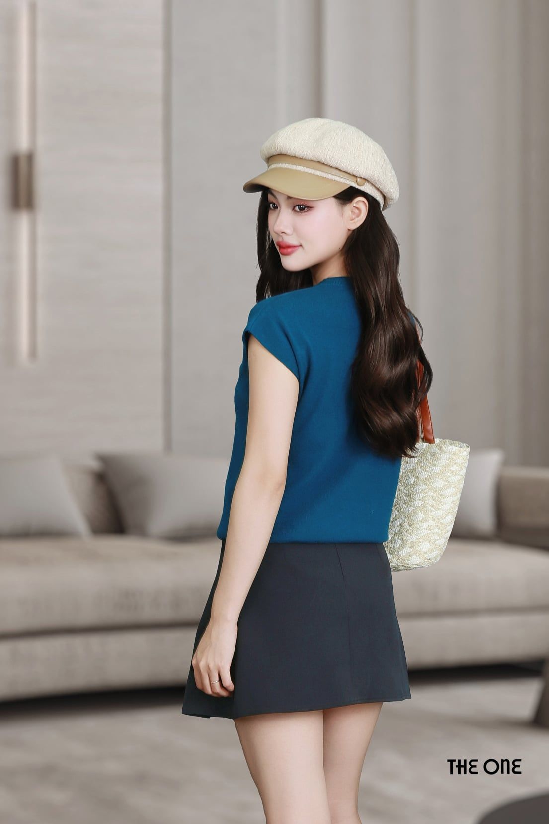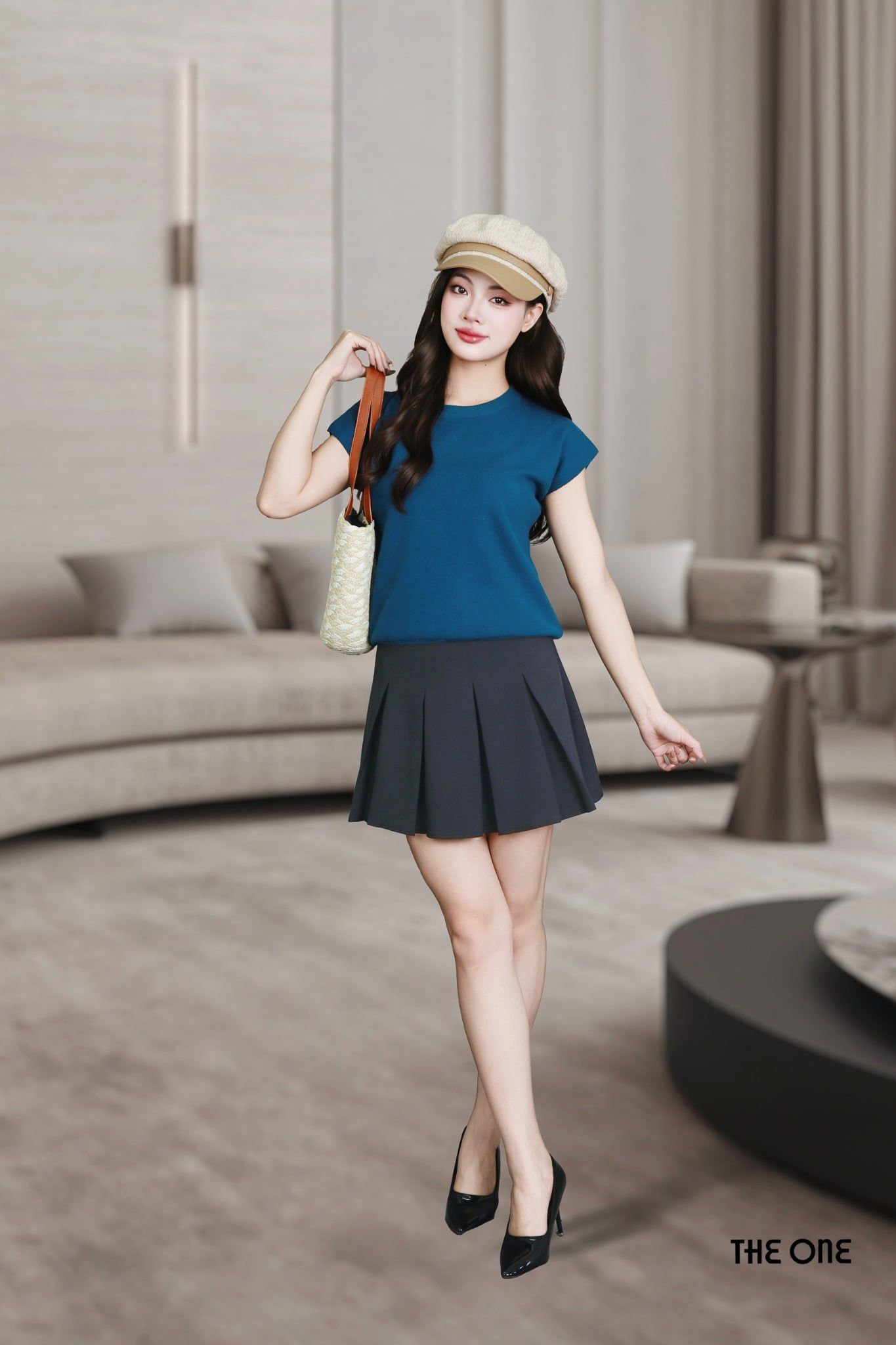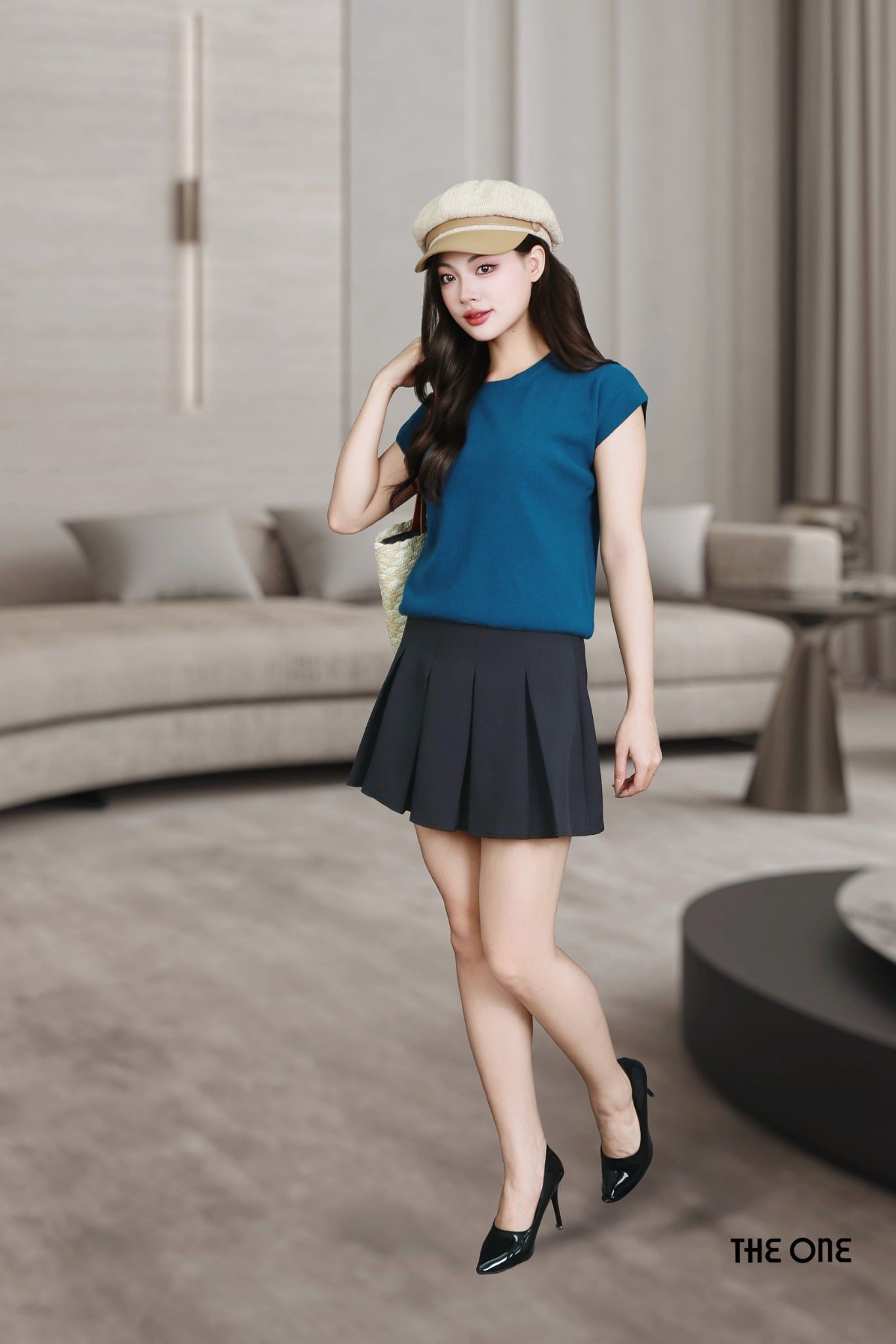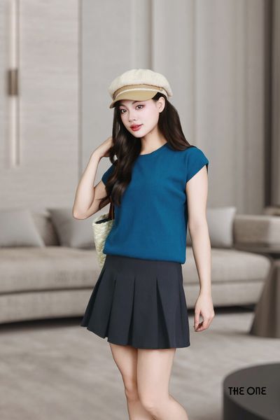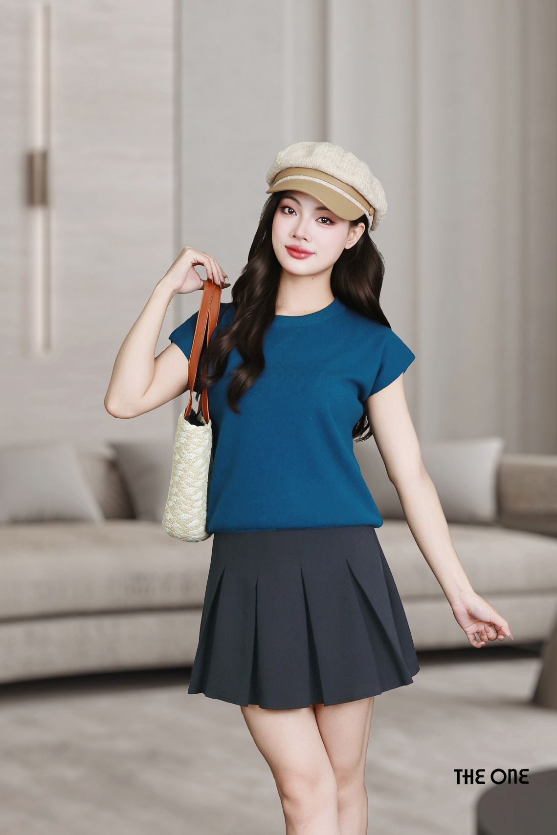 Áo len tăm xanh đậm cổ tròn tay cộc vai liền cánh rơi bo gấu