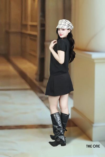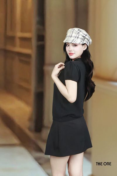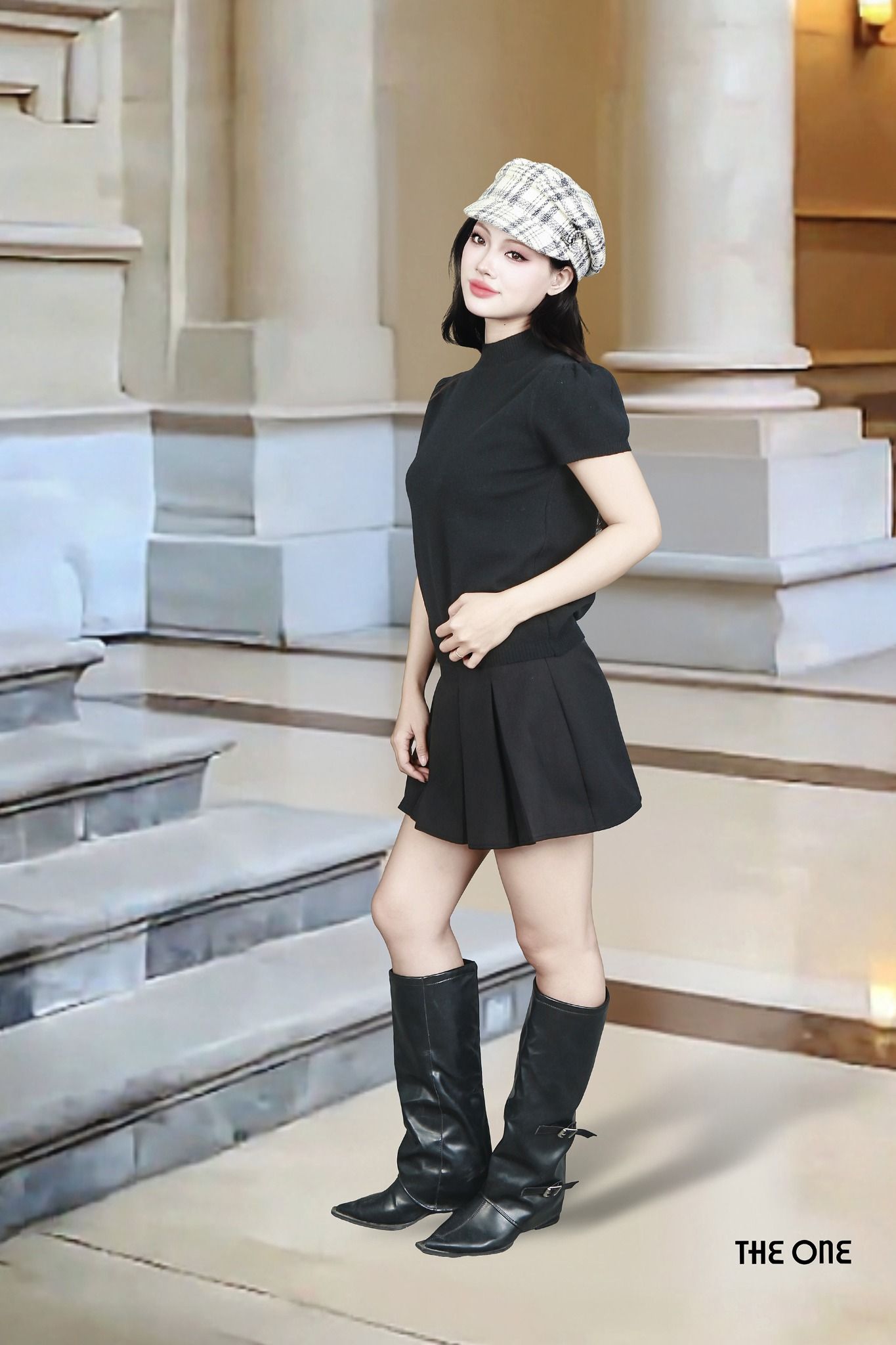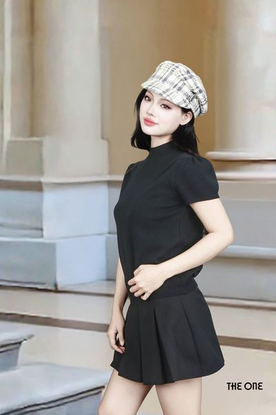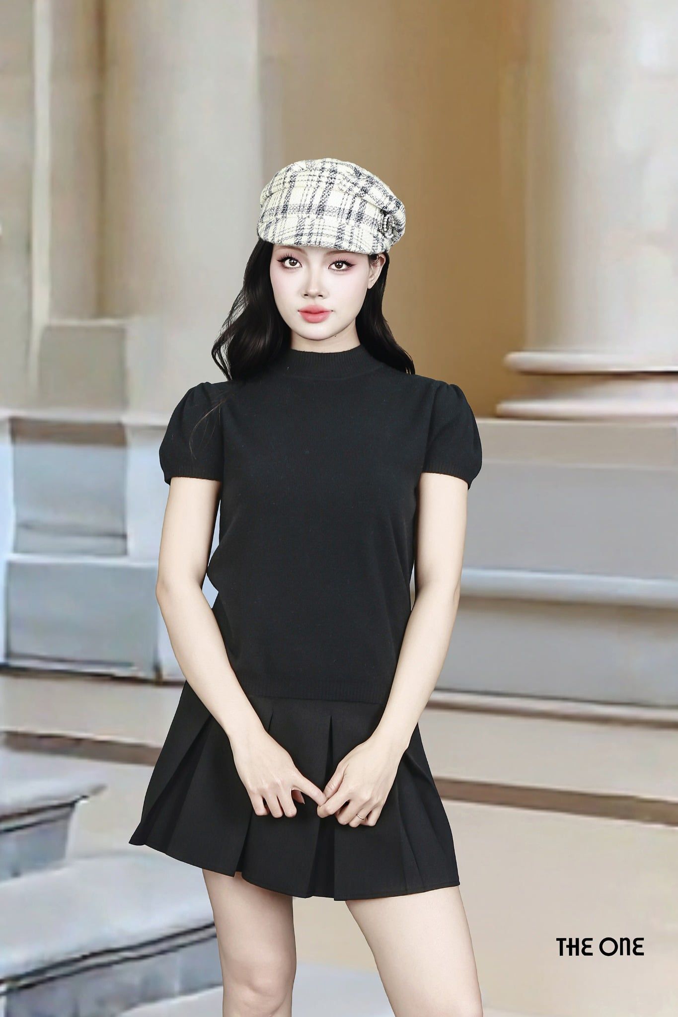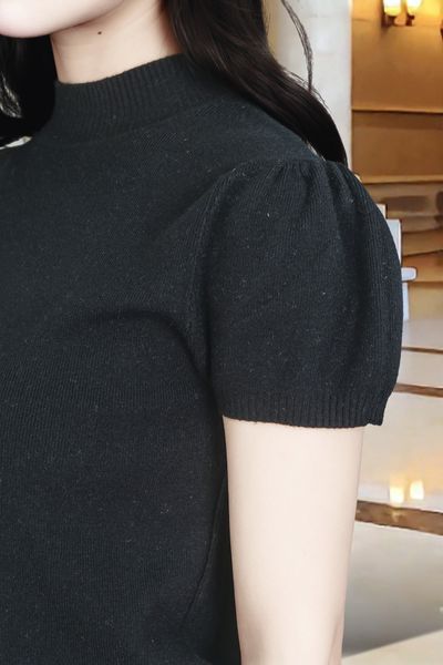 Áo len đen tay cộc vai bồng cổ 3cm bo gấu
