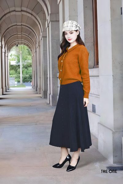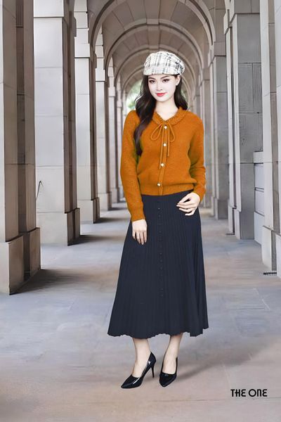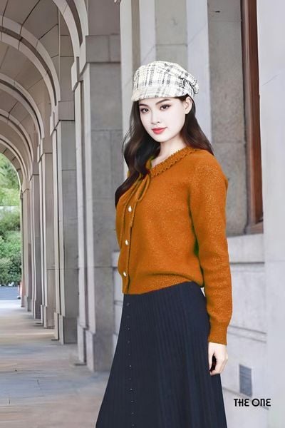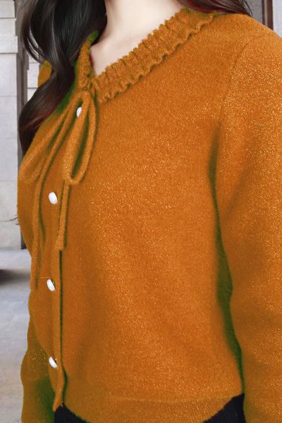 Áo len lông thỏ cam đậm kim tuyến tay dài bo gấu cổ bèo nơ