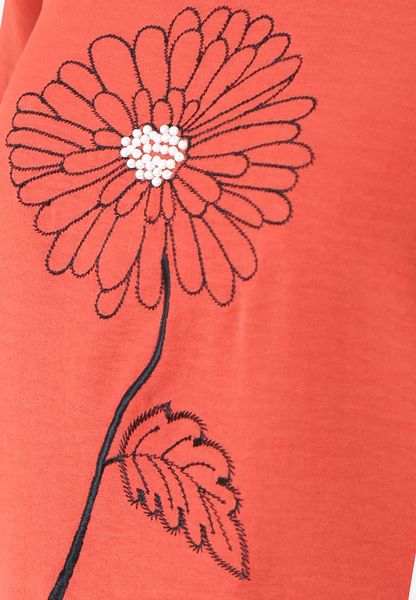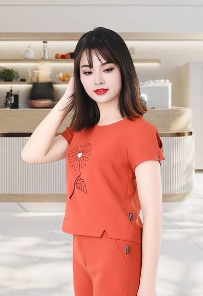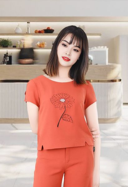 Áo sơ mi tay cộc đũi nhăn cam đất Hàn Quốc thêu hoa ngực đính đá xẻ tay xẻ gấu thân trước