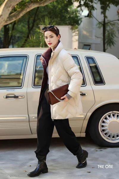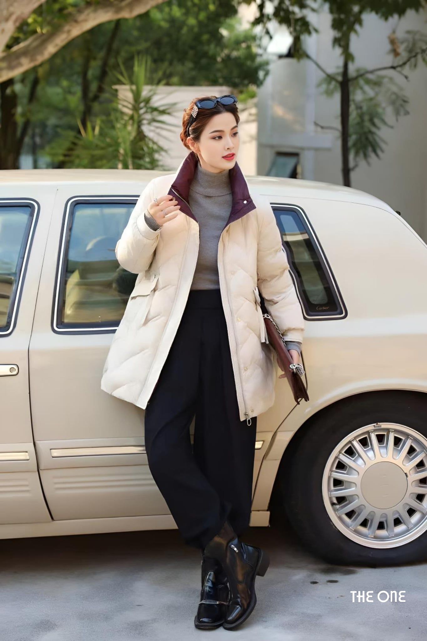 Áo phao be sáng dáng ngắn túi chéo đính khuy bo tay