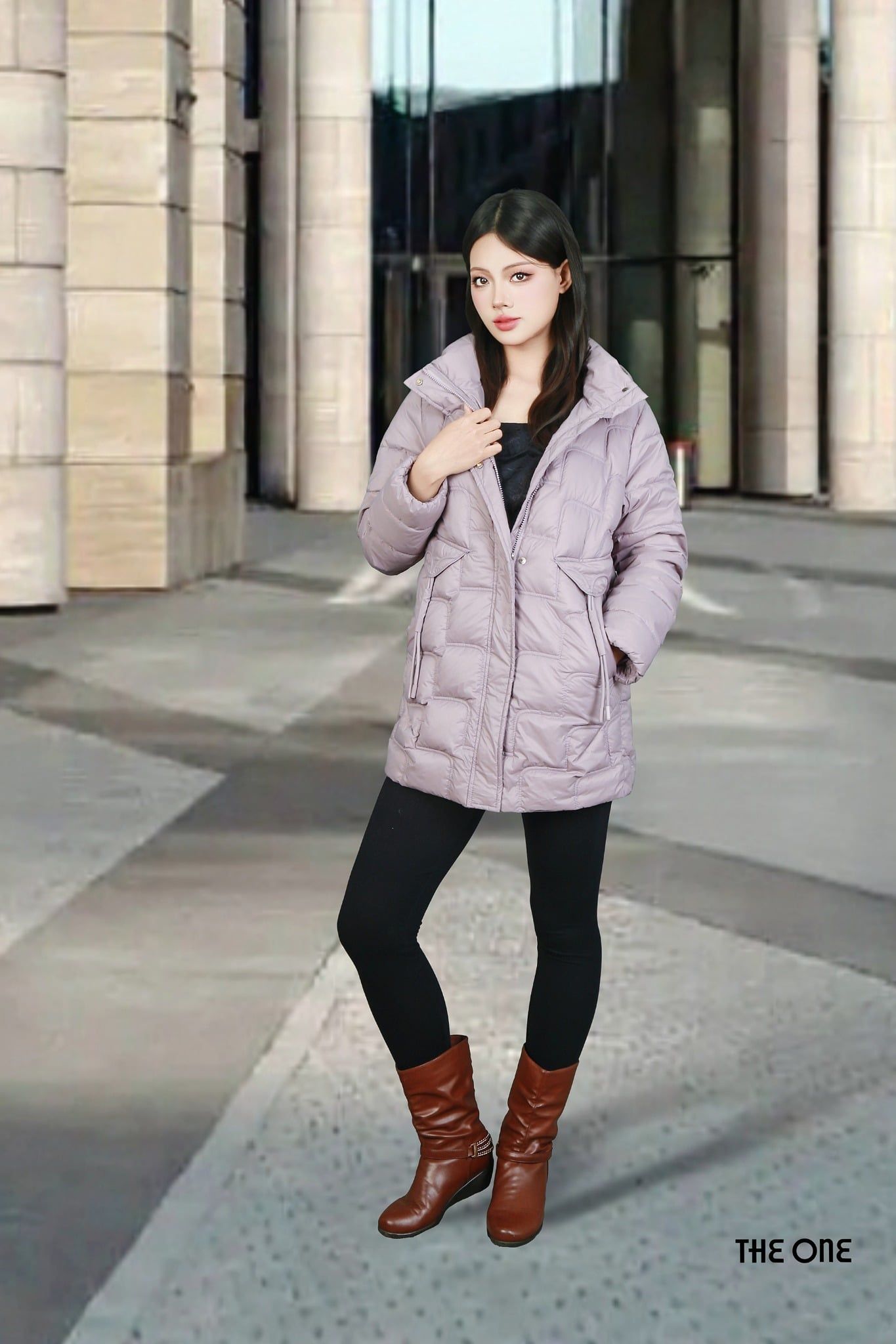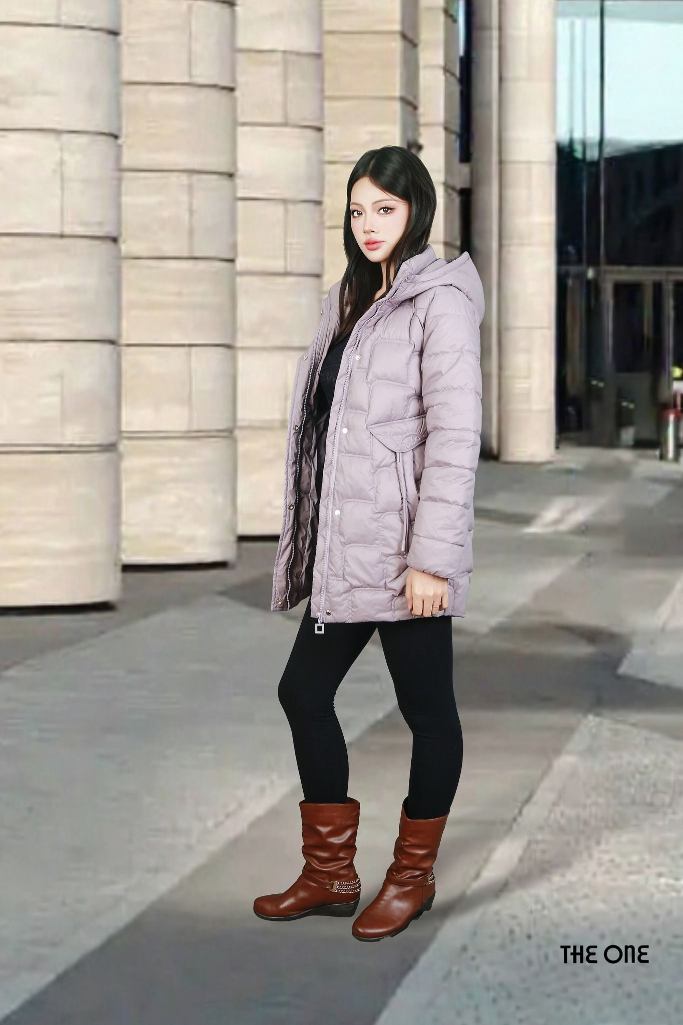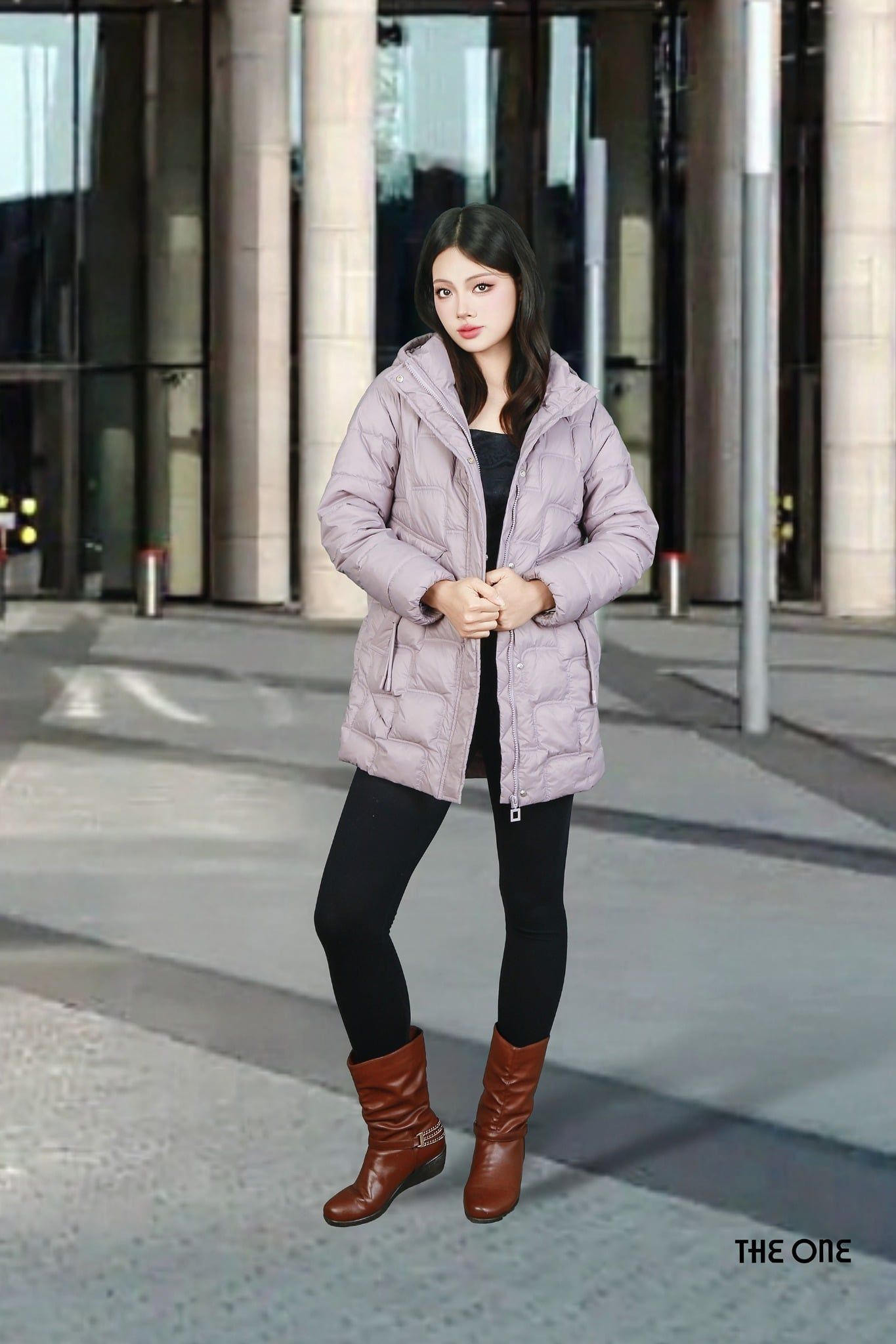 Áo phao tím nhạt dáng ngắn có mũ túi chéo nắp túi trang trí dây