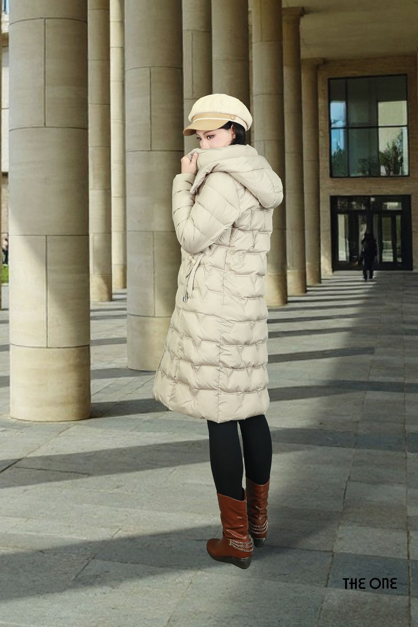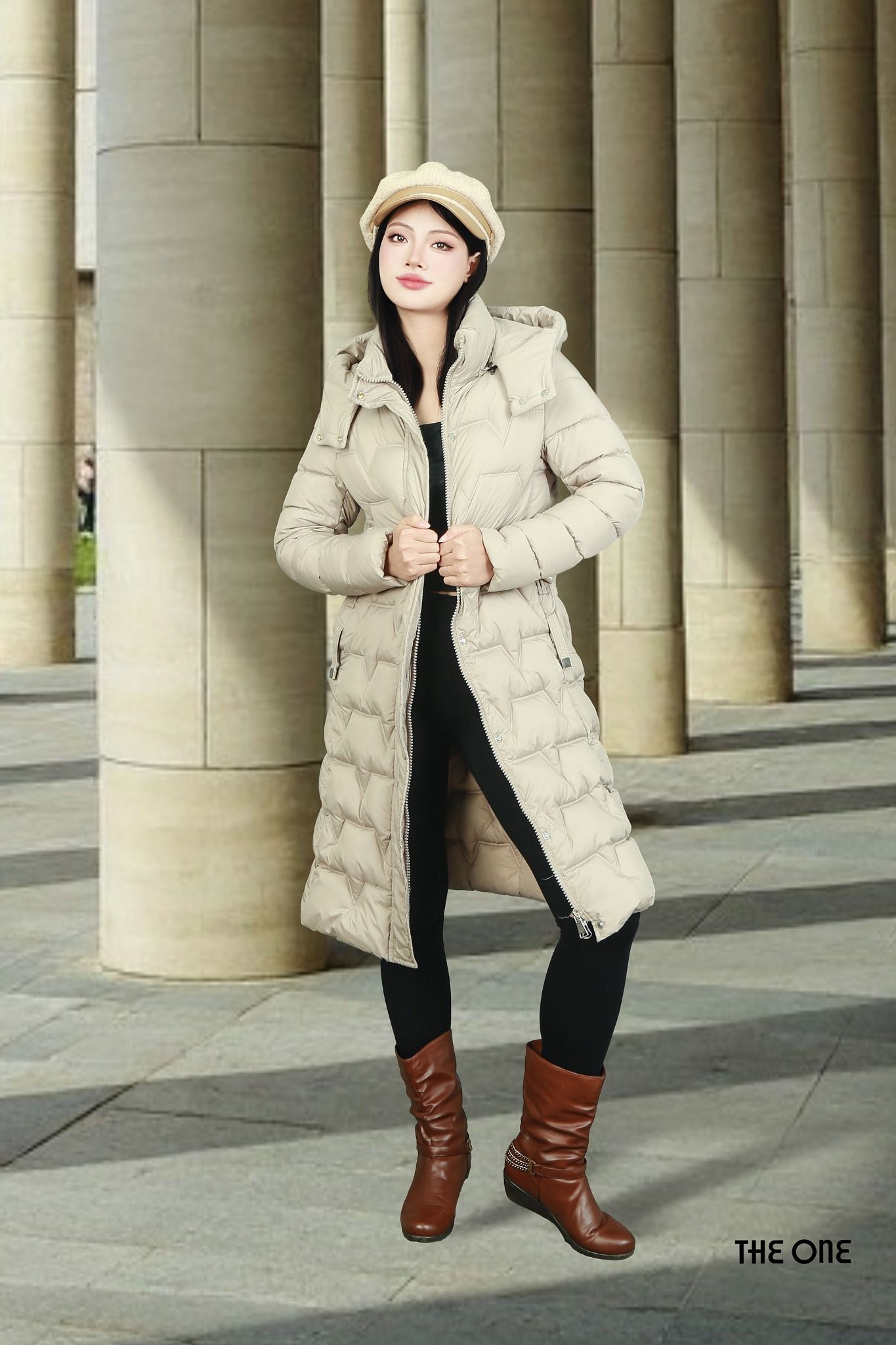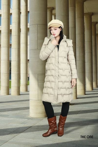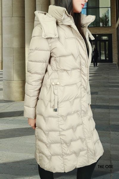 Áo phao dáng dài be có mũ 2 túi chéo
