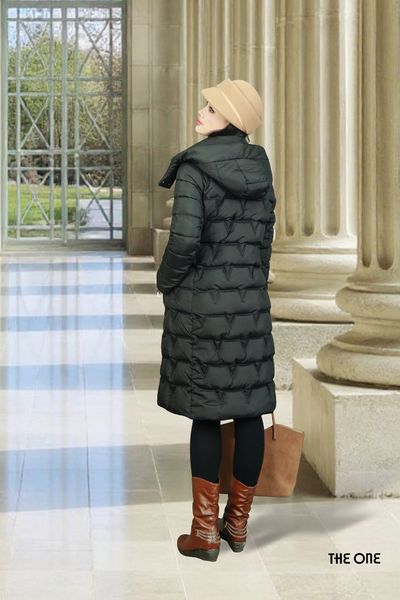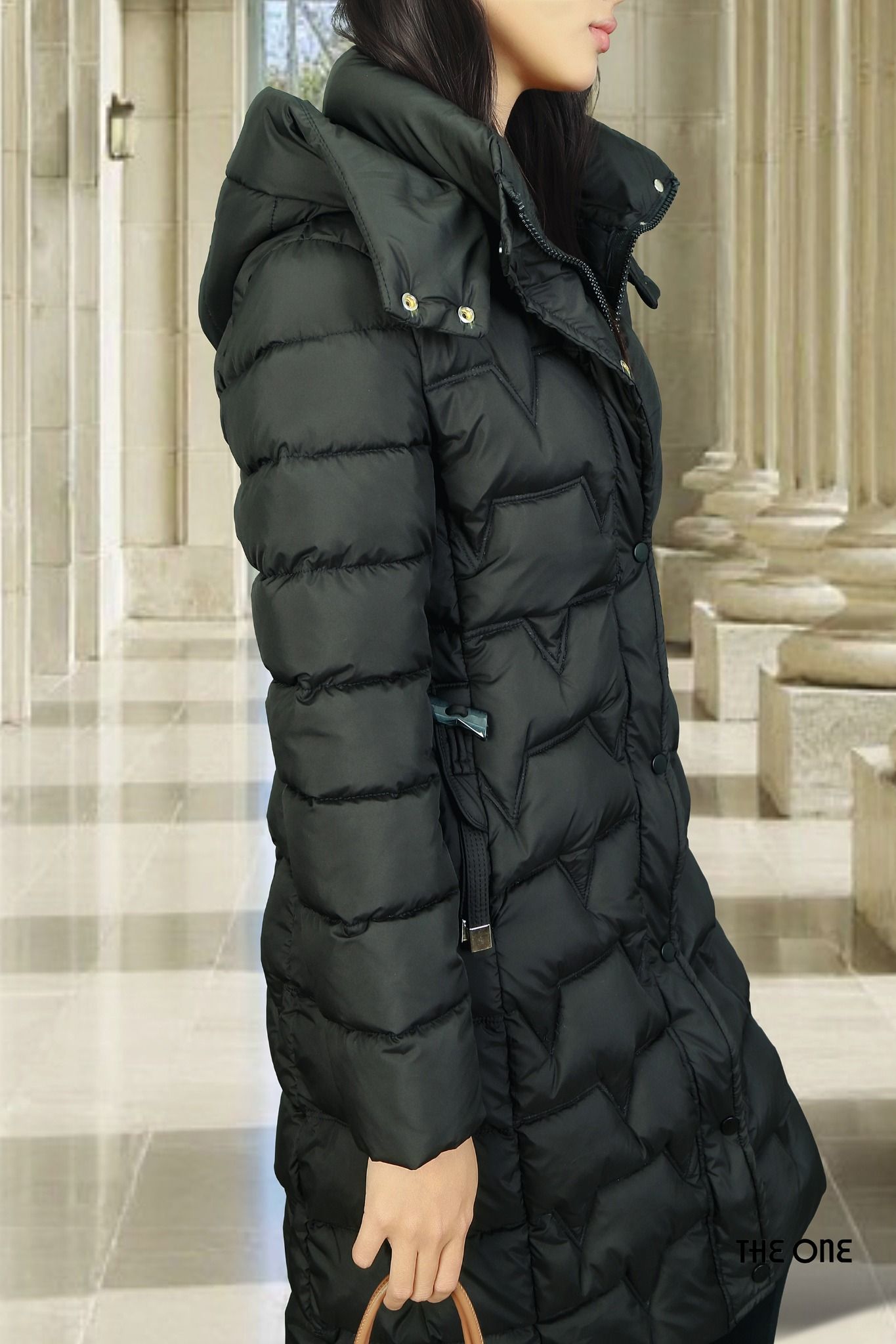 Áo phao dáng dài đen có mũ 2 túi chéo