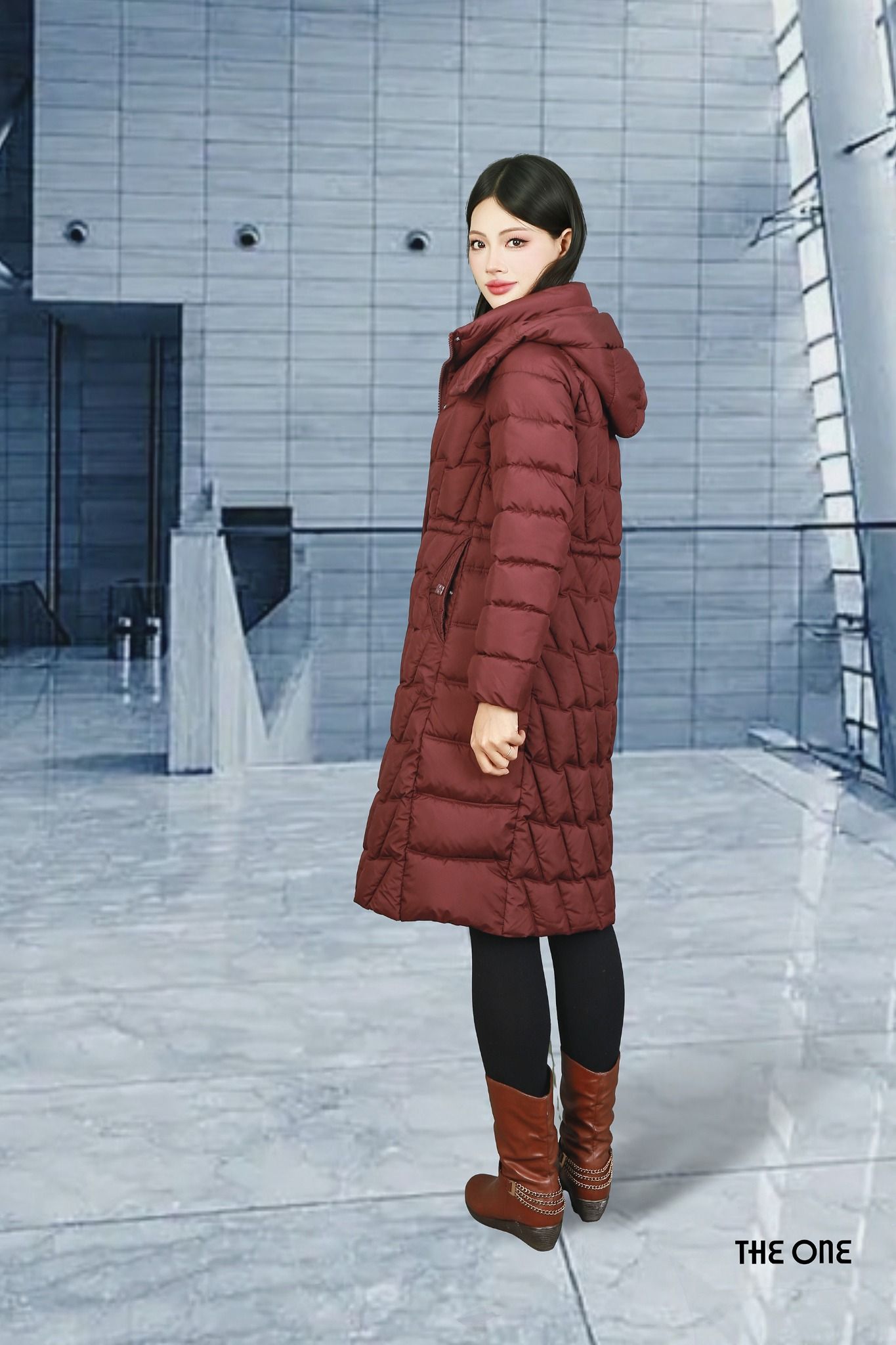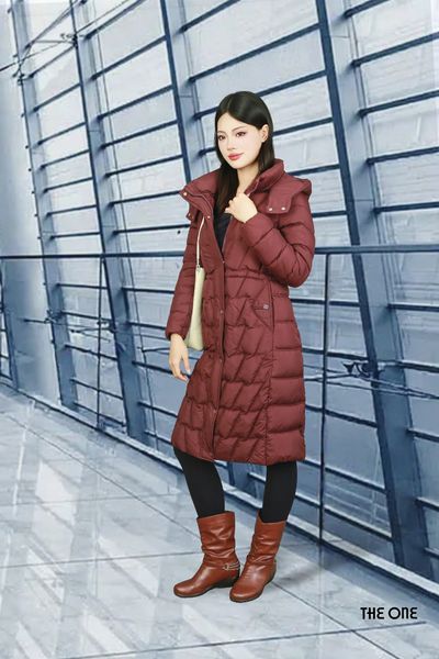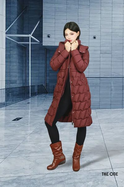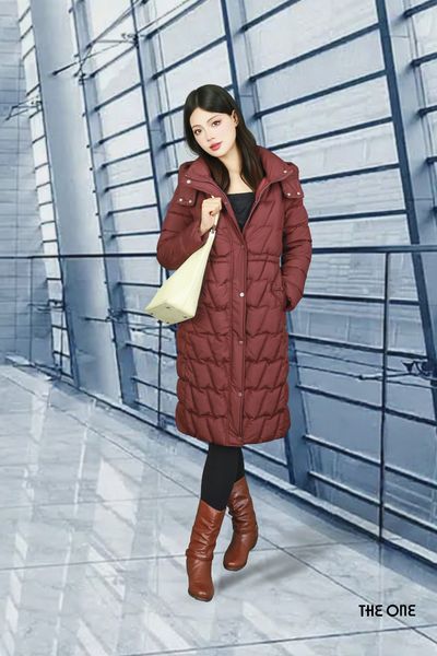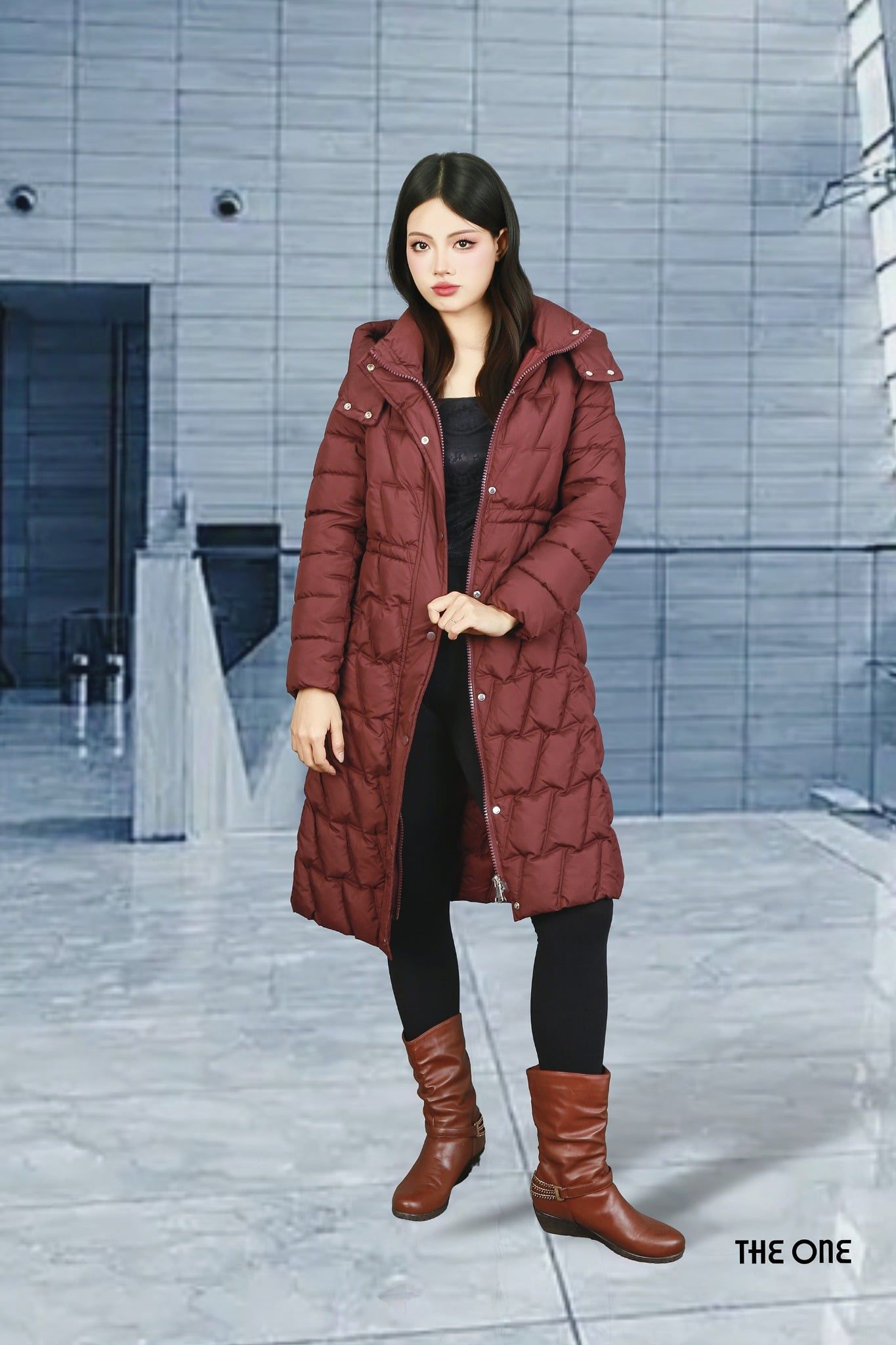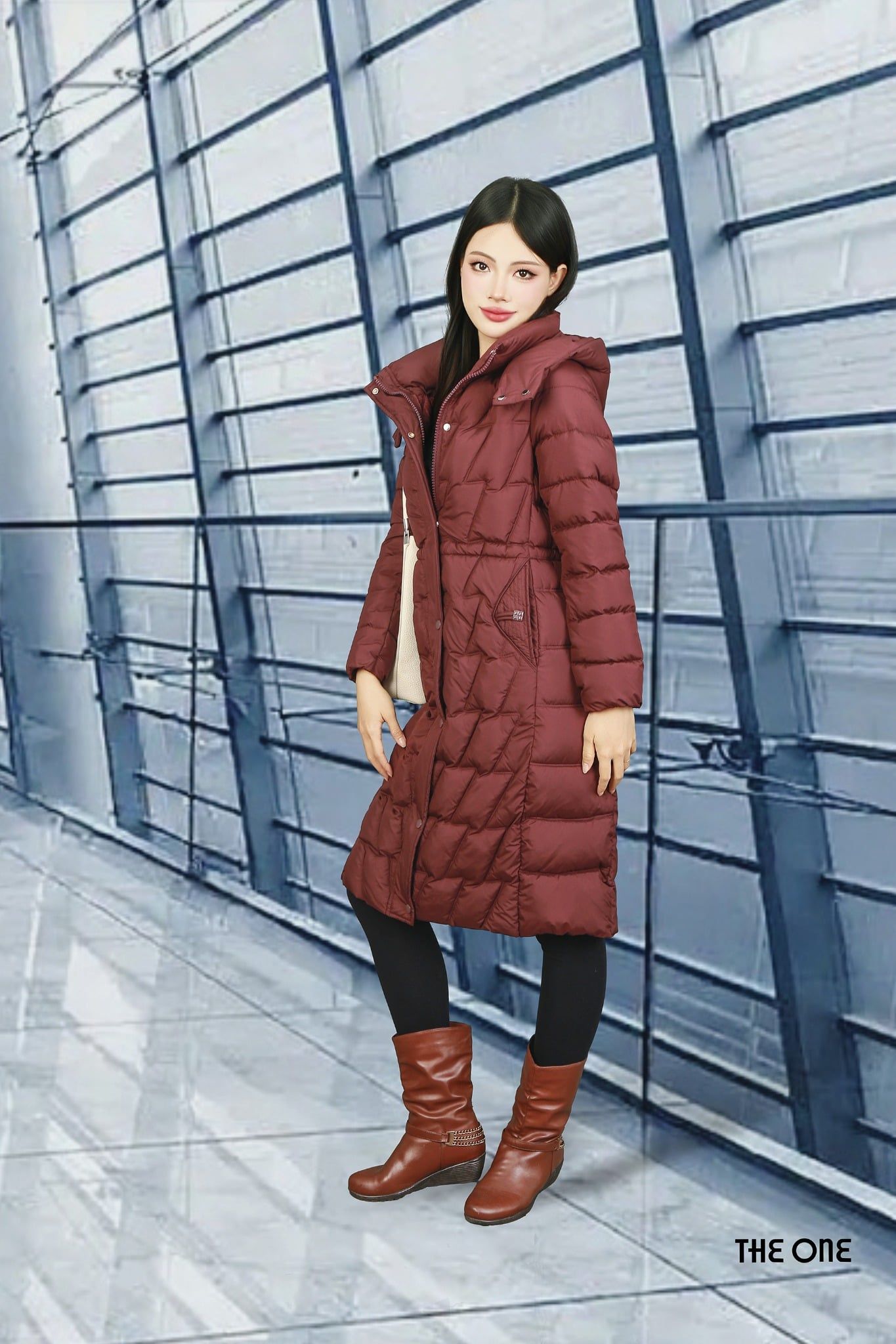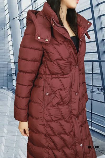 Áo phao dáng dài đỏ mận có mũ túi sườn rút eo