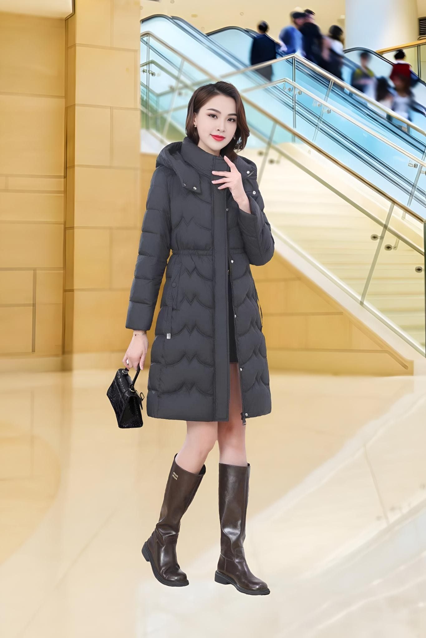 Áo phao dáng dài siêu nhẹ đen túi dọc trần chỉ kèm mũ