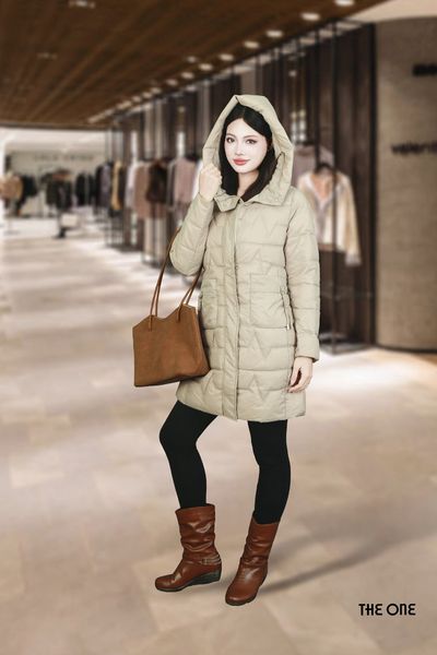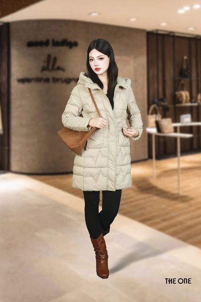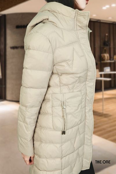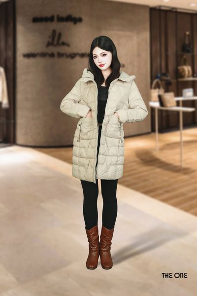 Áo phao dáng dài be đậm có mũ 2 túi vuông