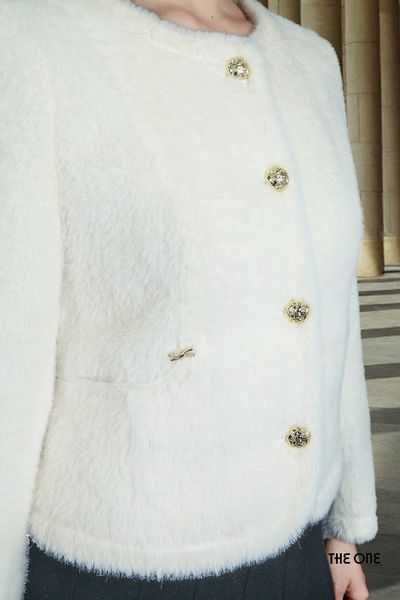 Áo khoác lửng tay dài dạ lông trắng cổ tròn túi cong