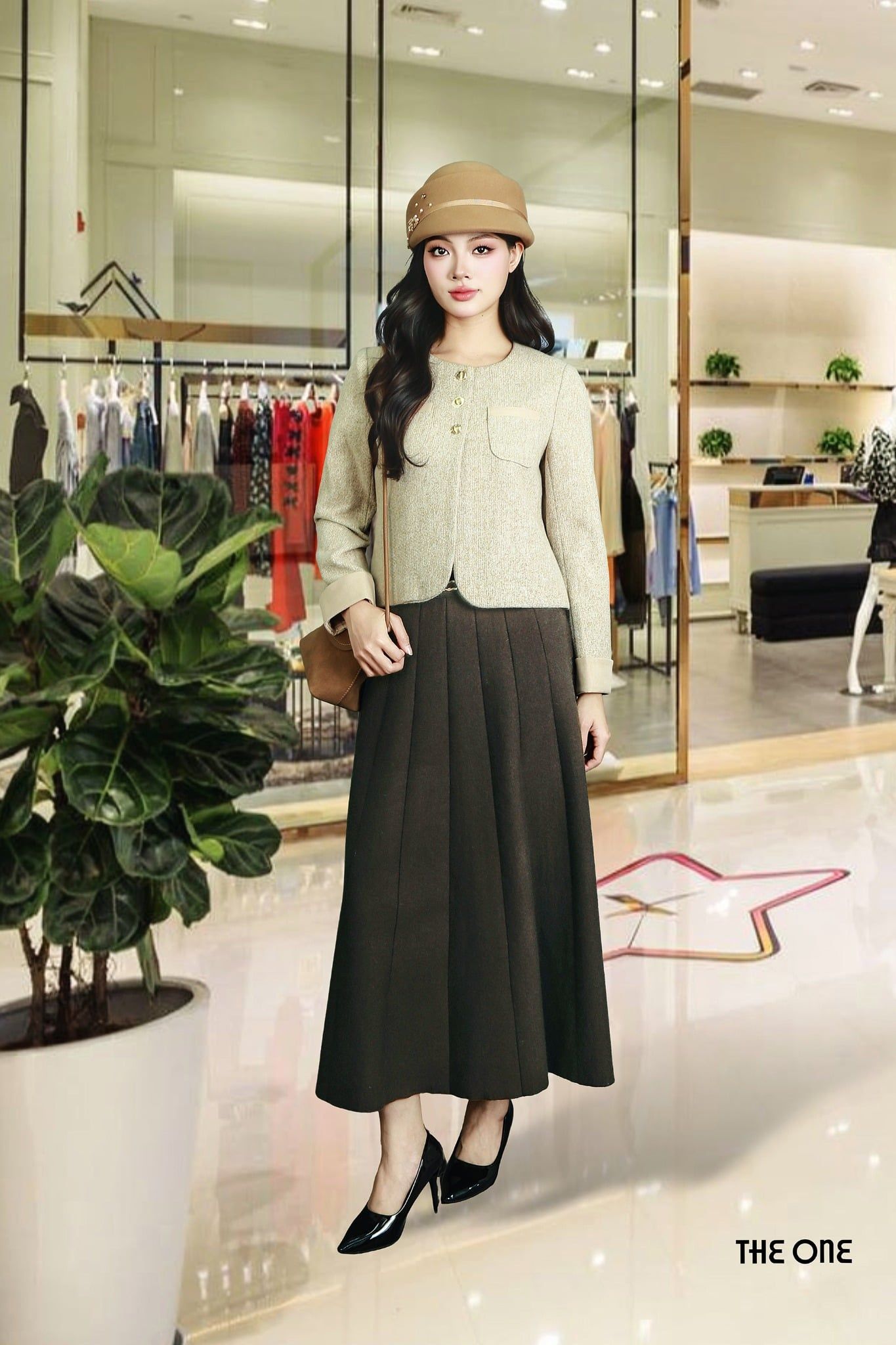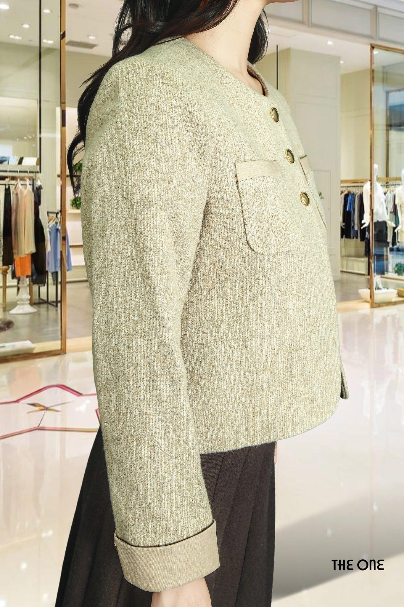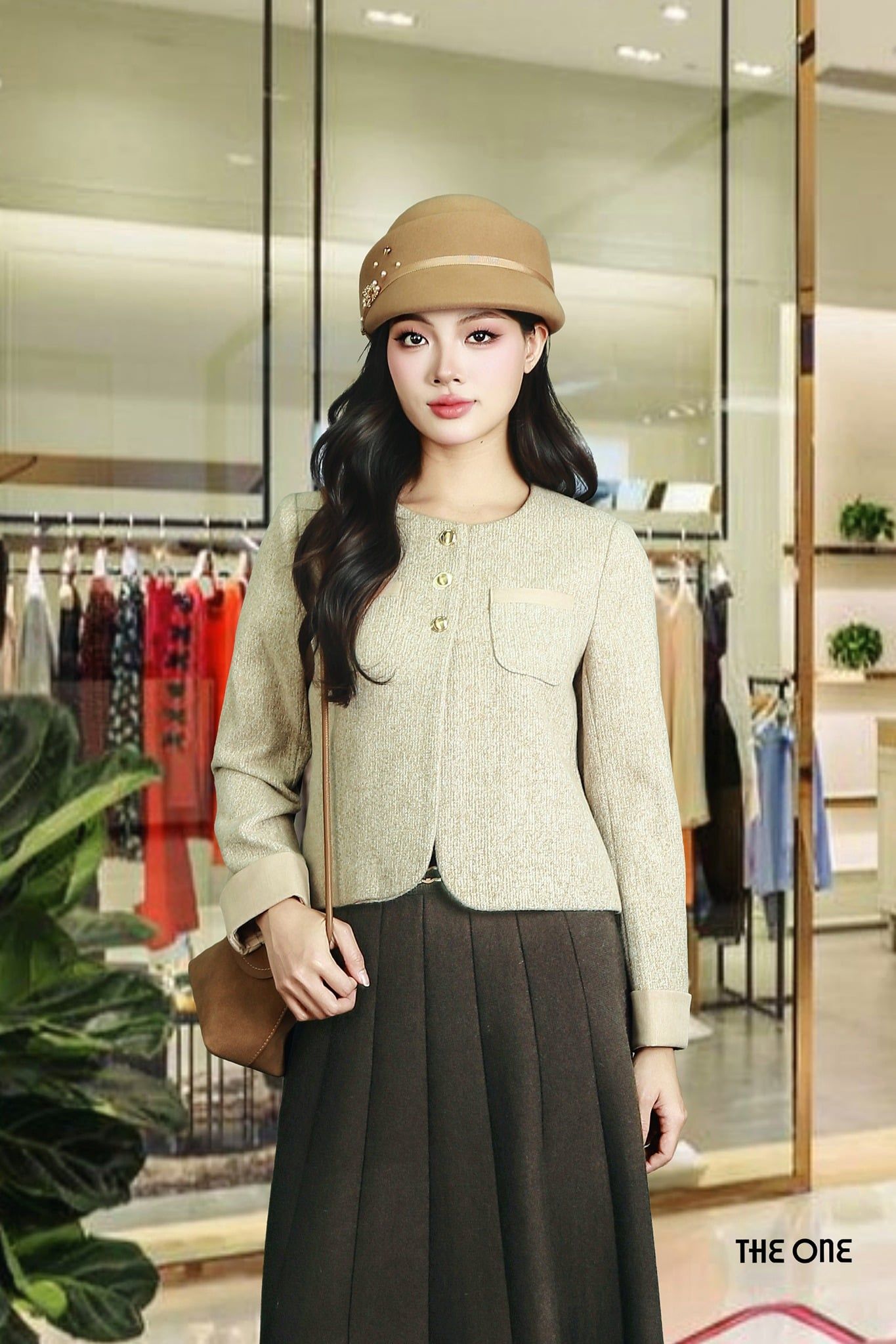 Áo vest dạ 2 lớp tay dài dạ Tweed nâu nhạt cổ tròn túi ốp ngực tay lơ vê