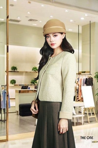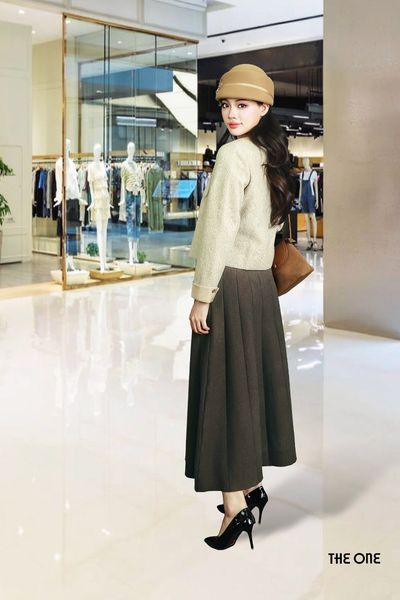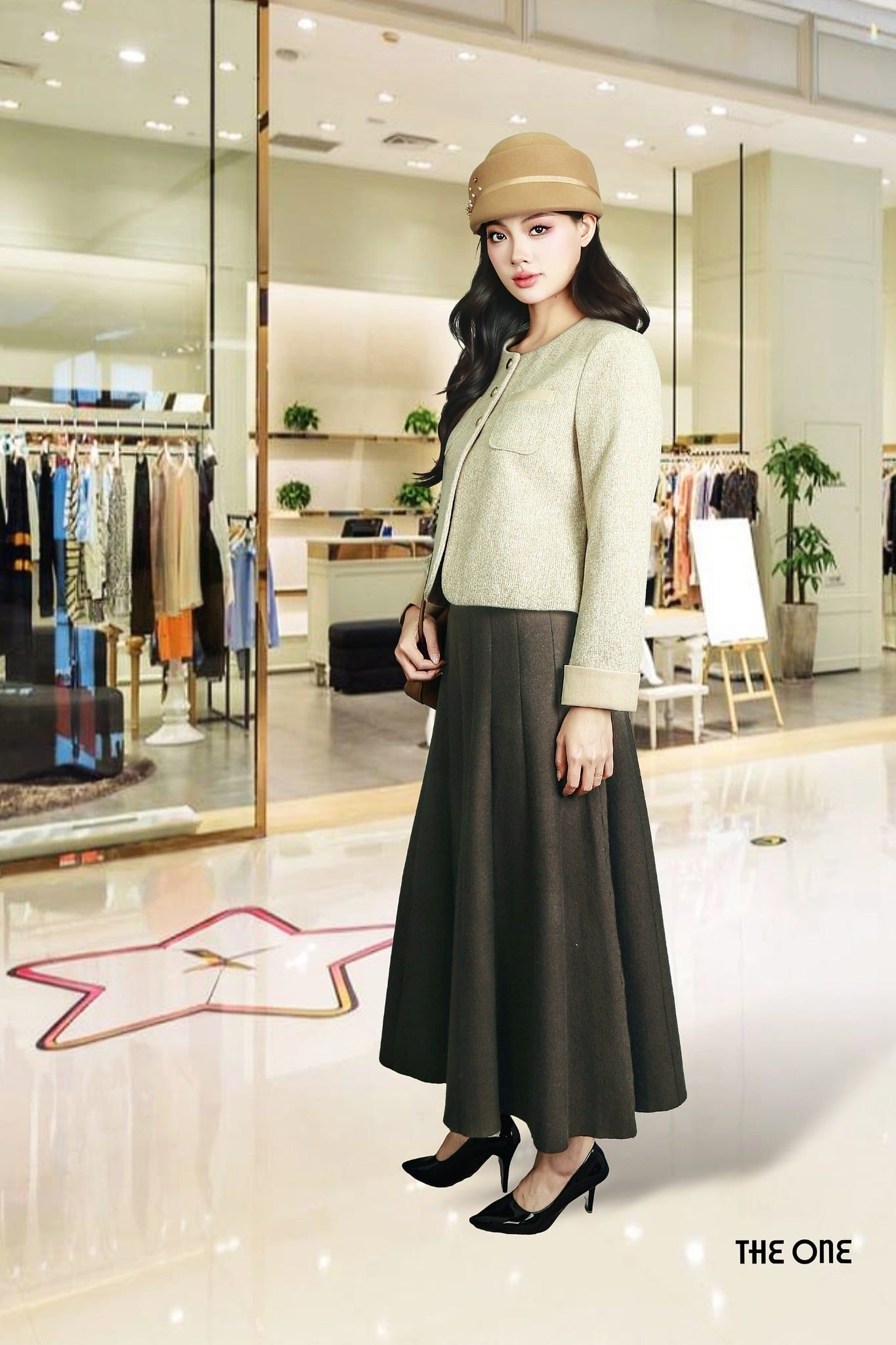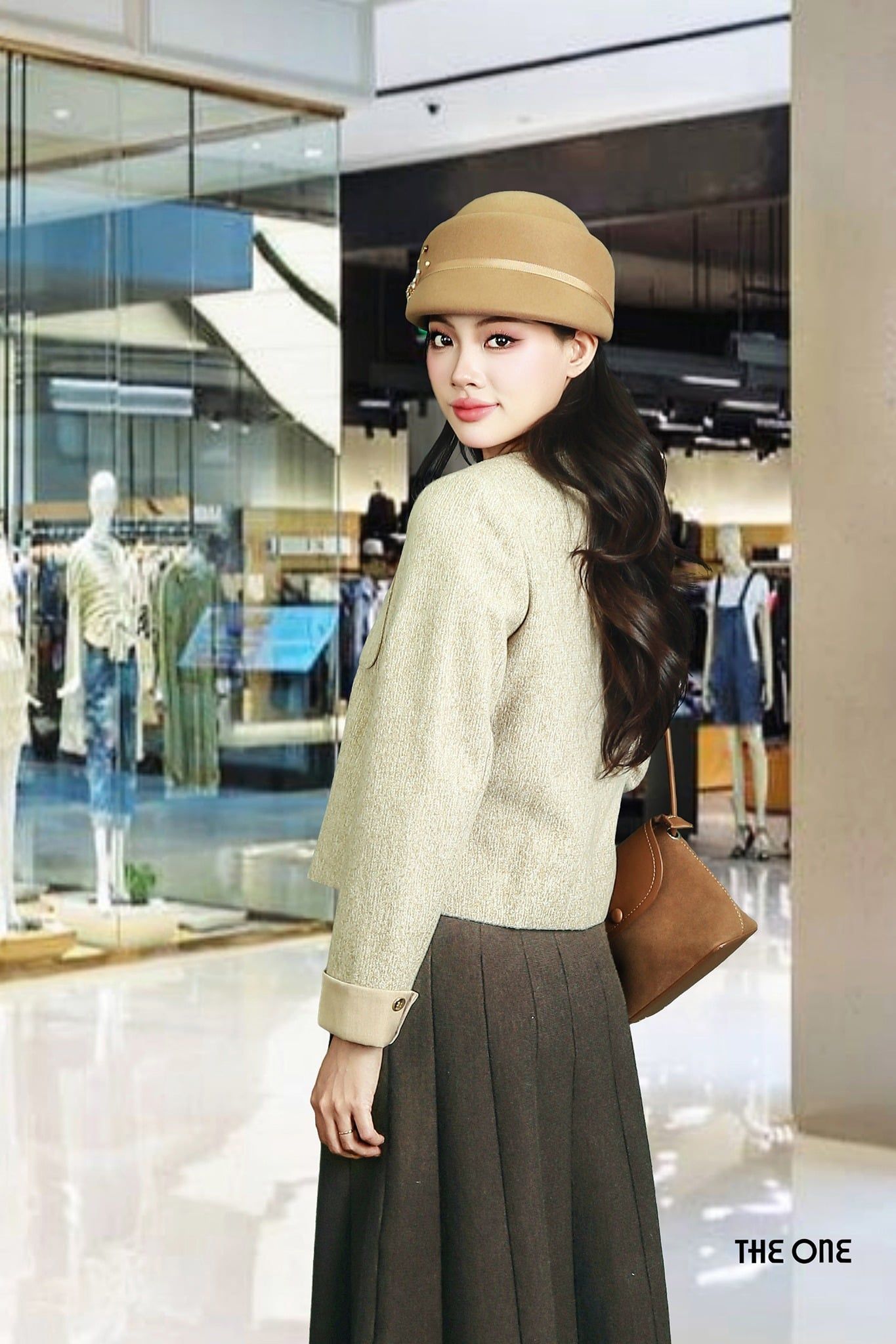 Áo vest dạ 2 lớp tay dài dạ Tweed nâu nhạt cổ tròn túi ốp ngực tay lơ vê