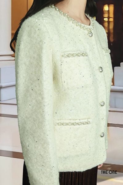 Áo vest dạ 2 lớp tay dài dạ Tweed trắng KT cổ tròn 4 túi ốp đính trang trí