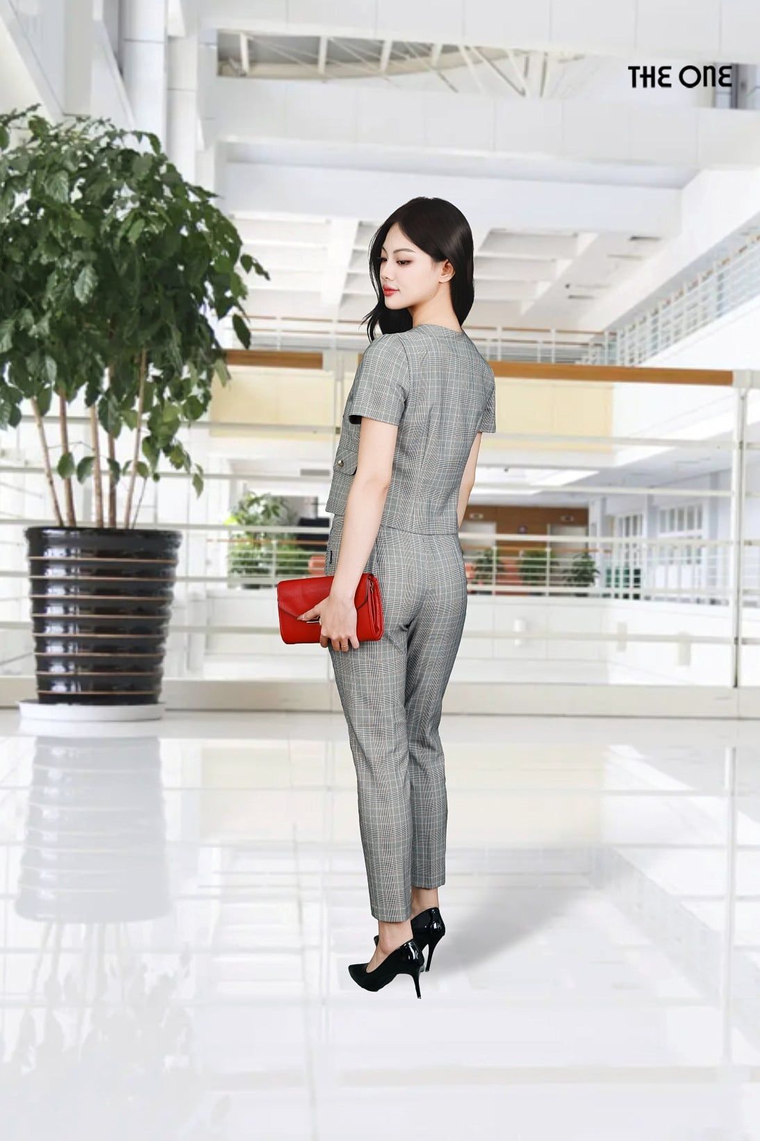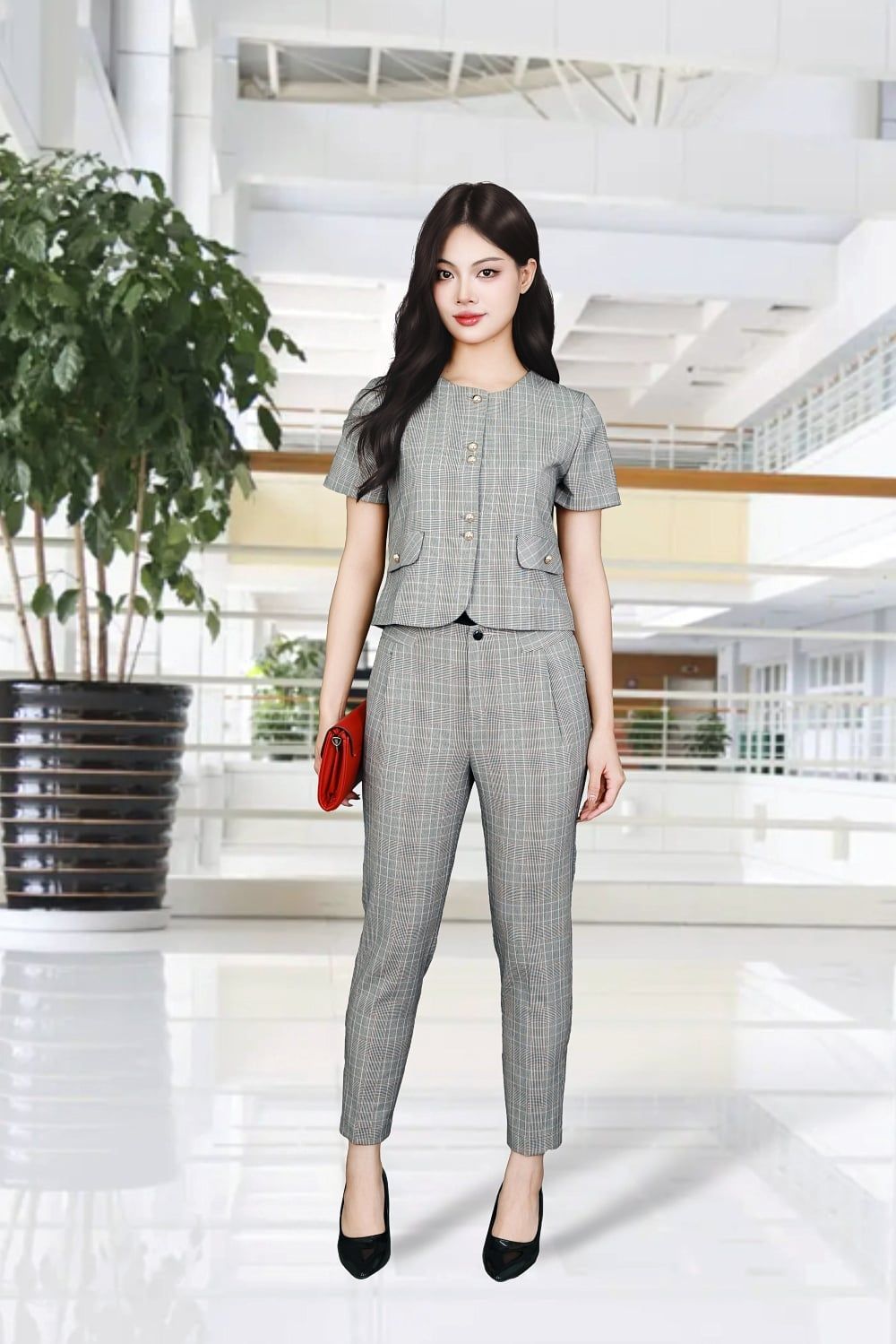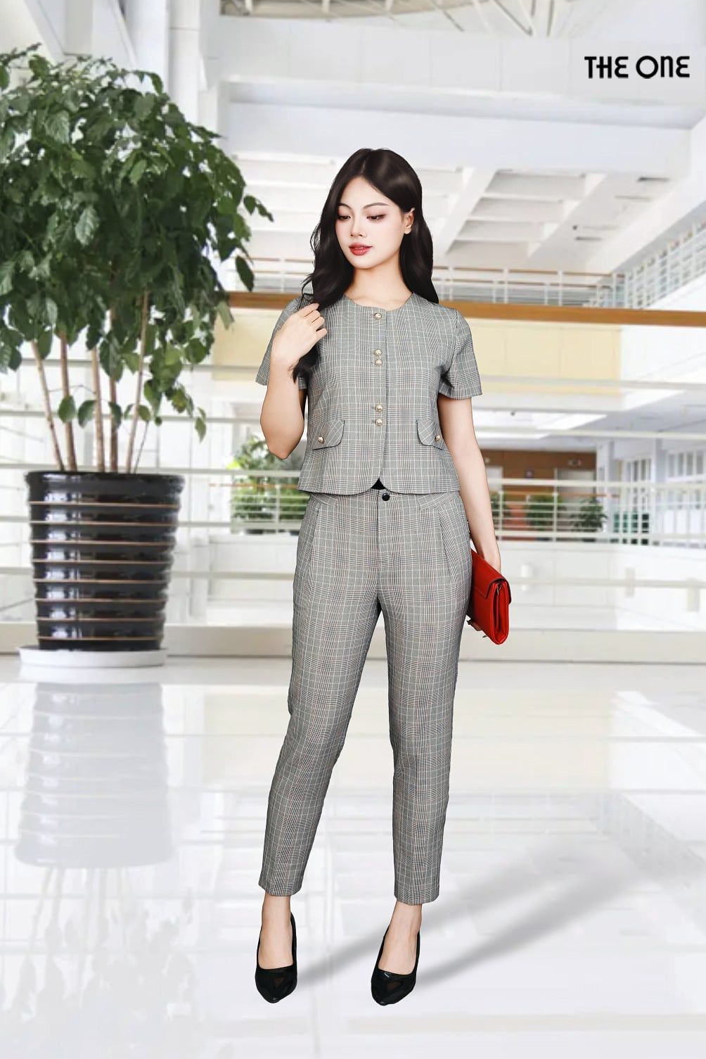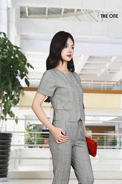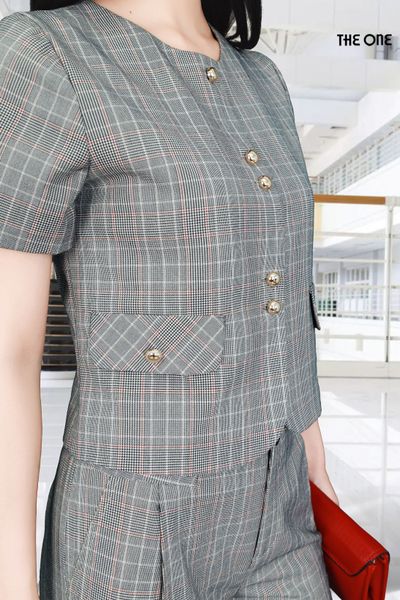 Áo vest 1 lớp tay cộc thô caro vàng cổ tròn 2 nắp túi khuy đồng