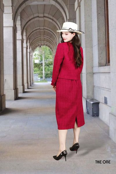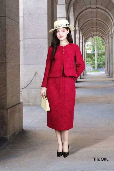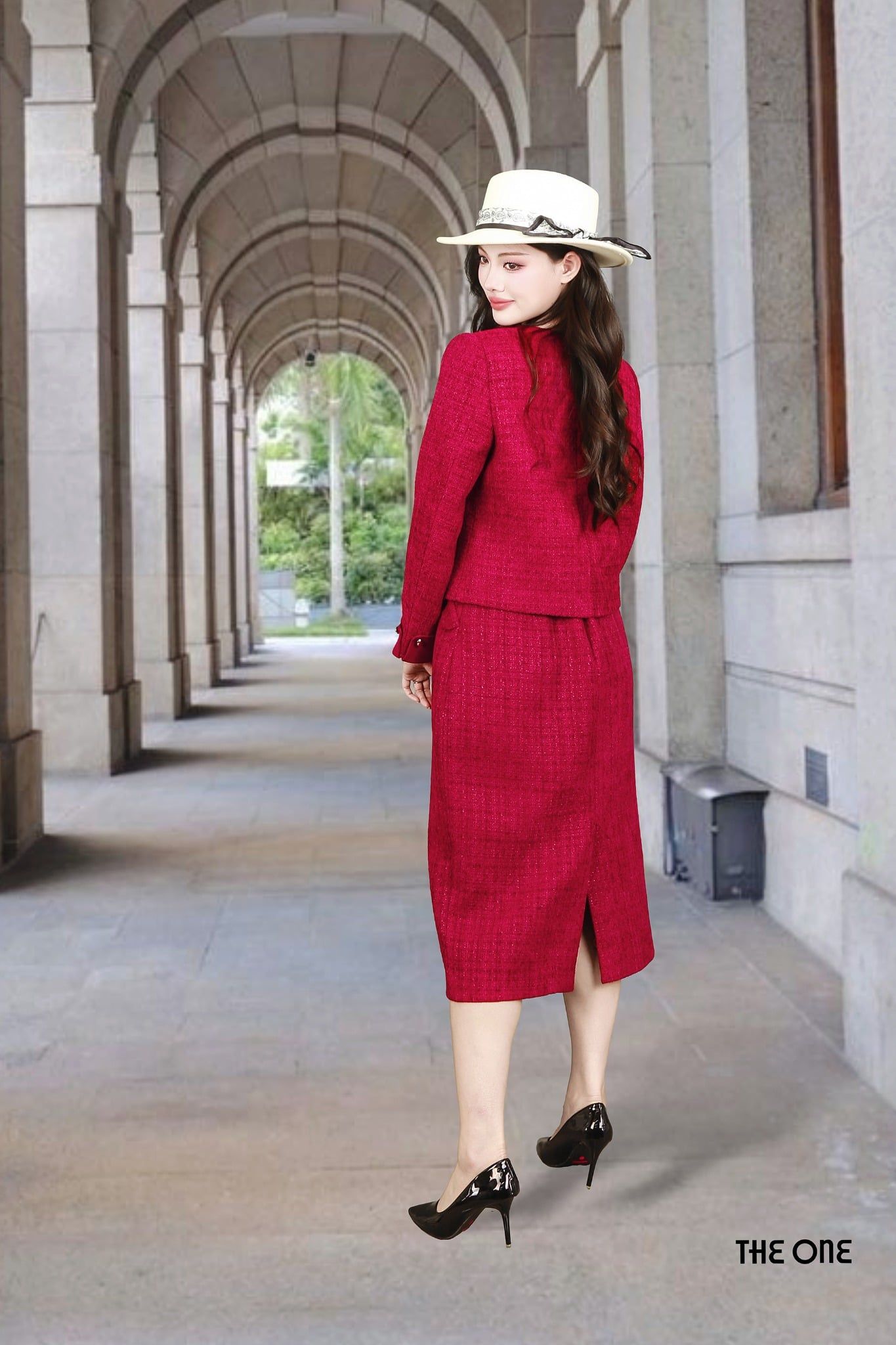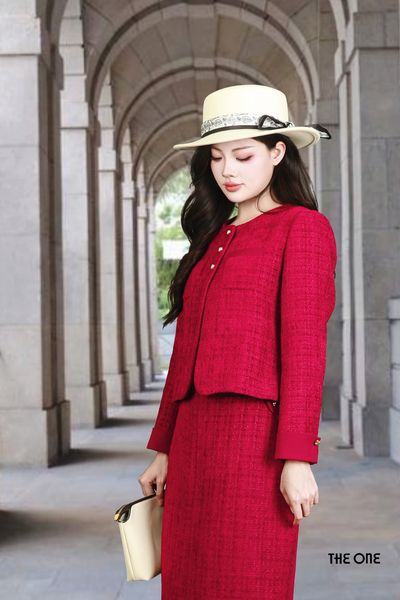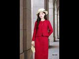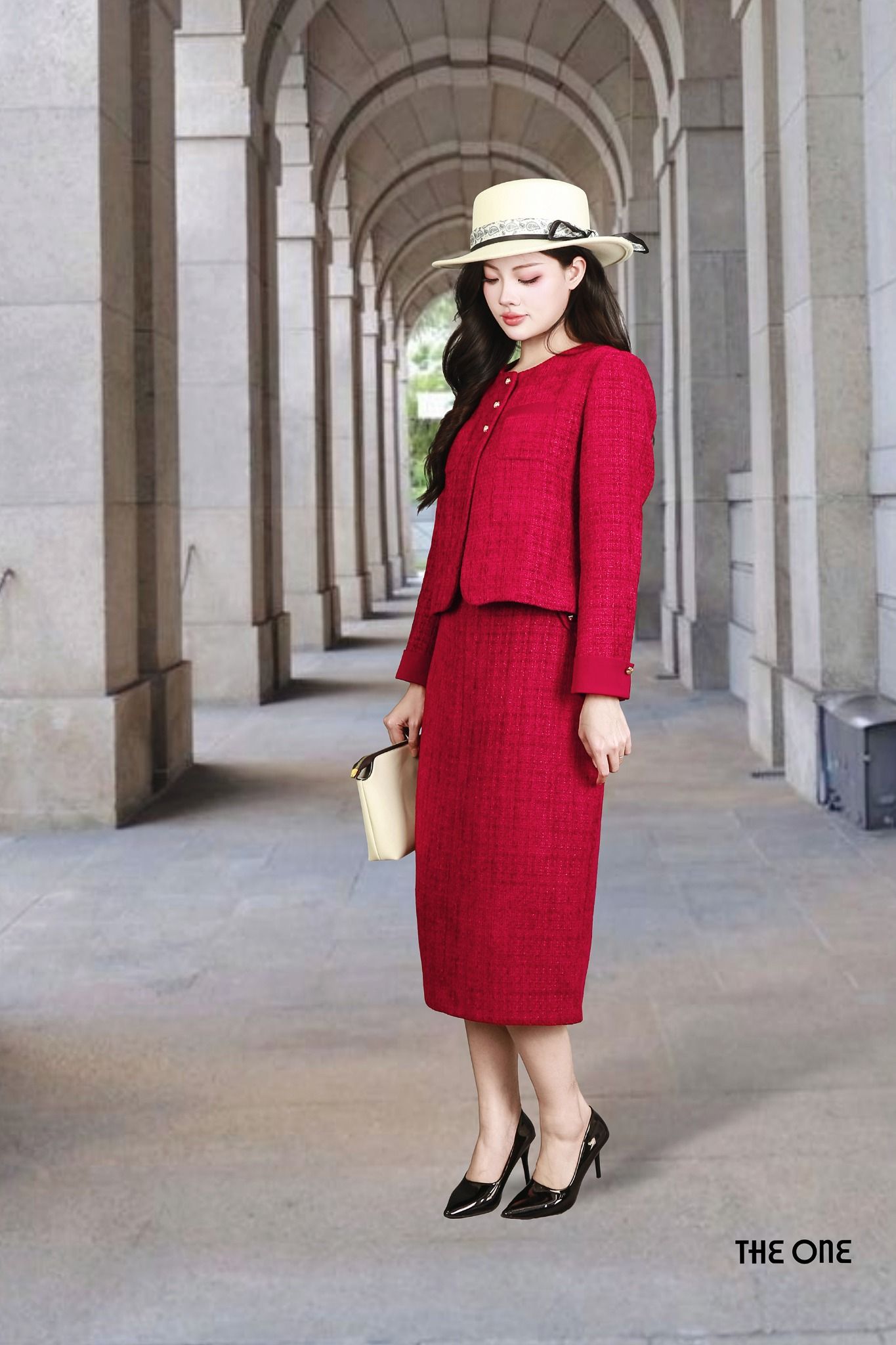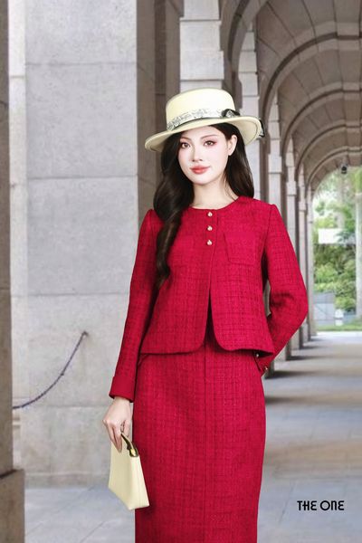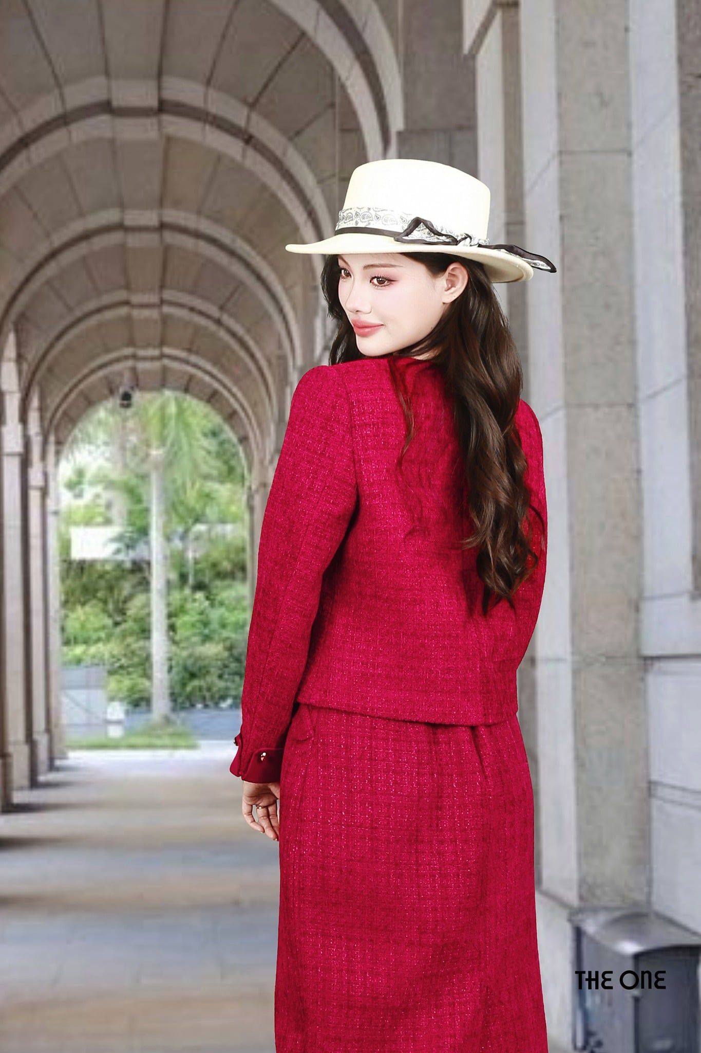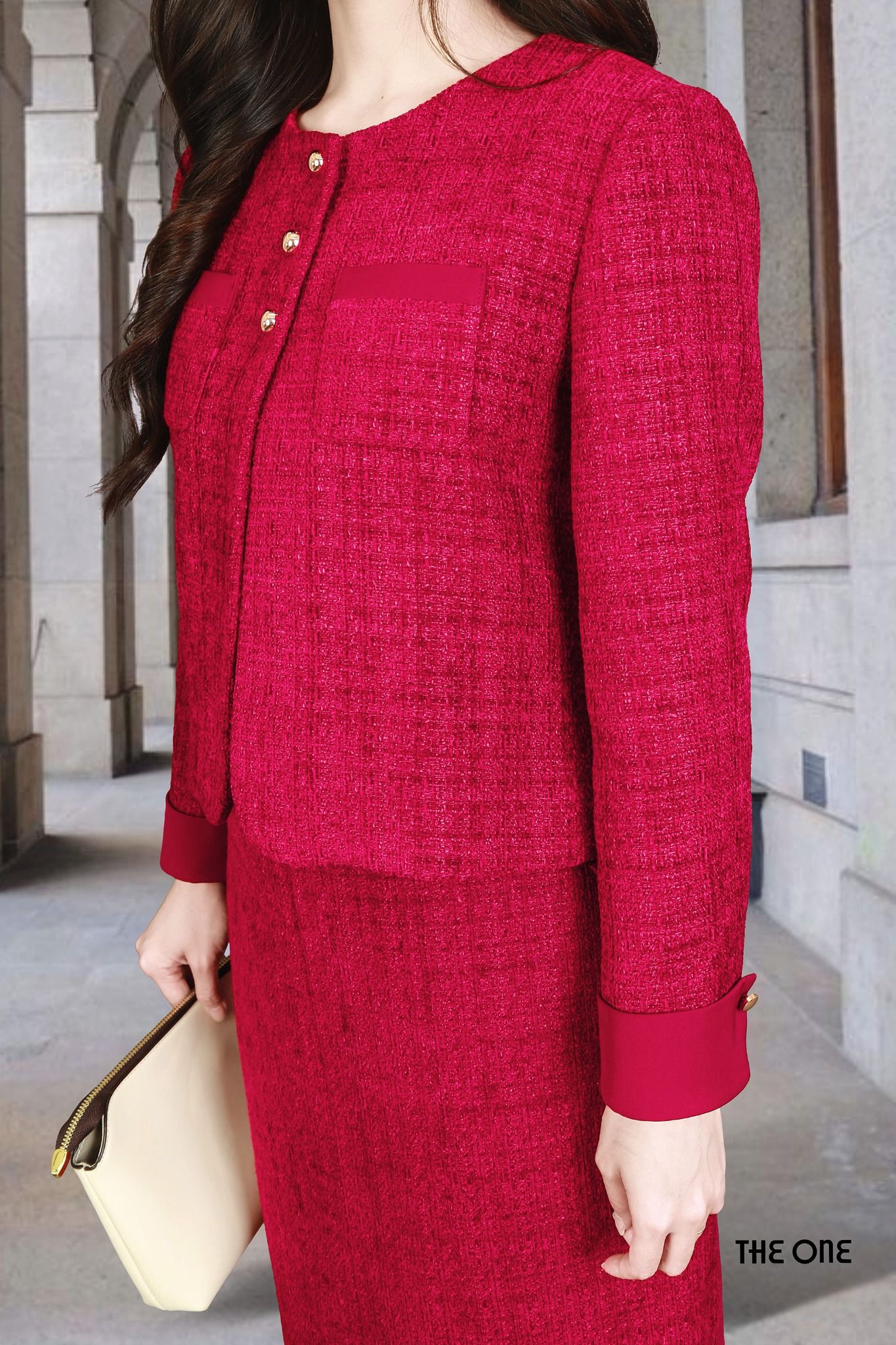 Áo vest dạ 2 lớp tay dài dạ Tweed đỏ đô cổ tròn túi ốp ngực tay lơ vê