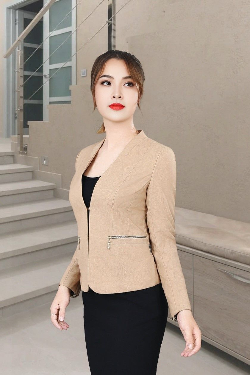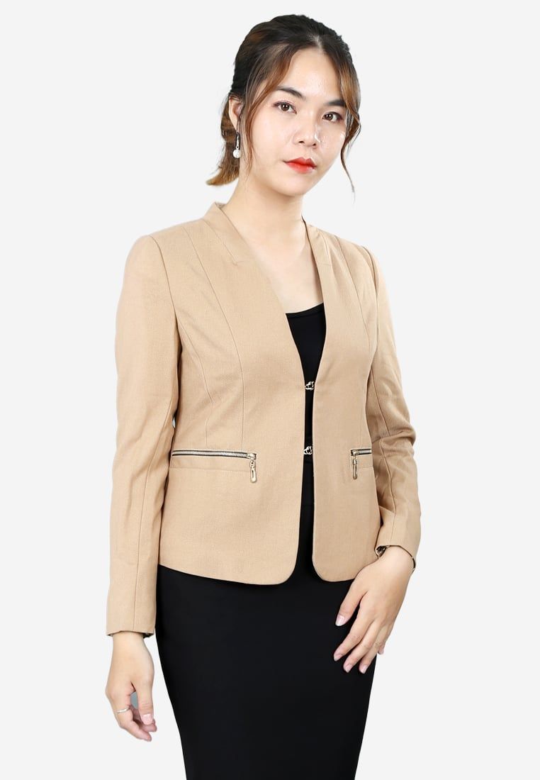 Áo vest gạo nâu nhạt 2 lớp tay dài cổ tàu 2 khóa túi