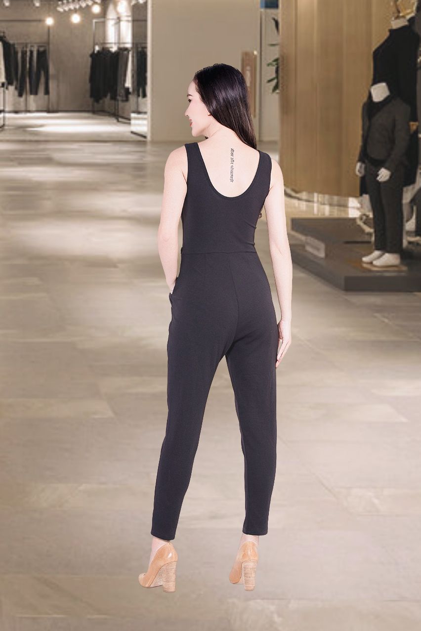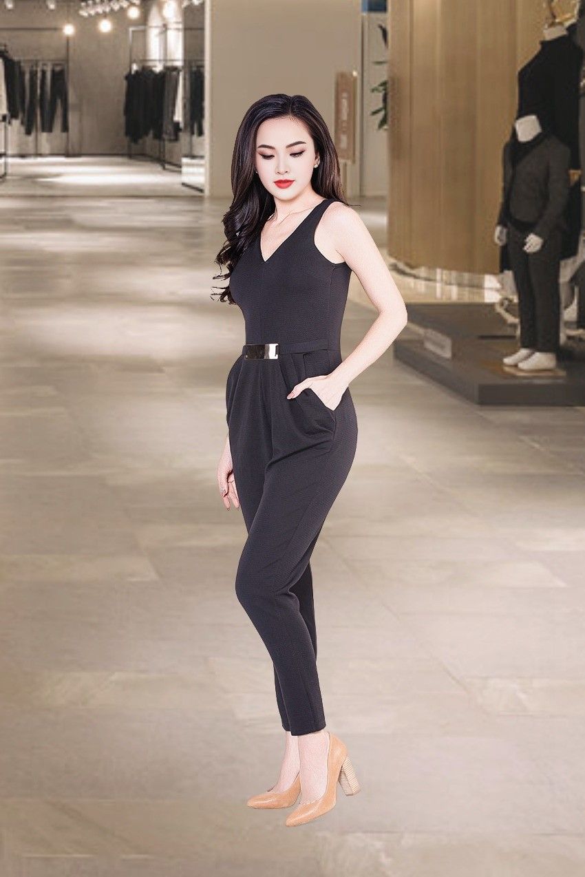 Bộ Jumpsuit dài vải xốp đen cổ tim eo trang trí