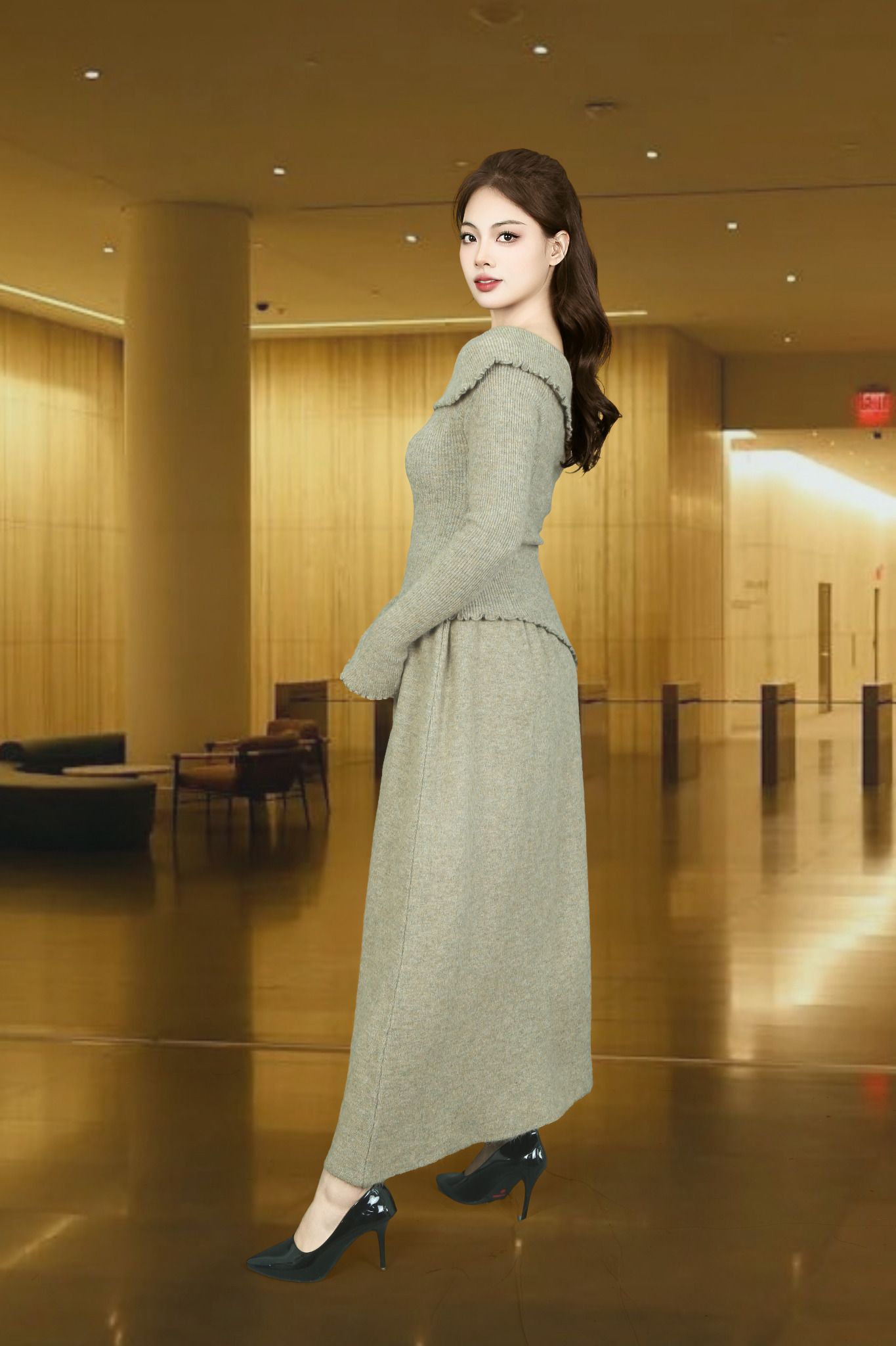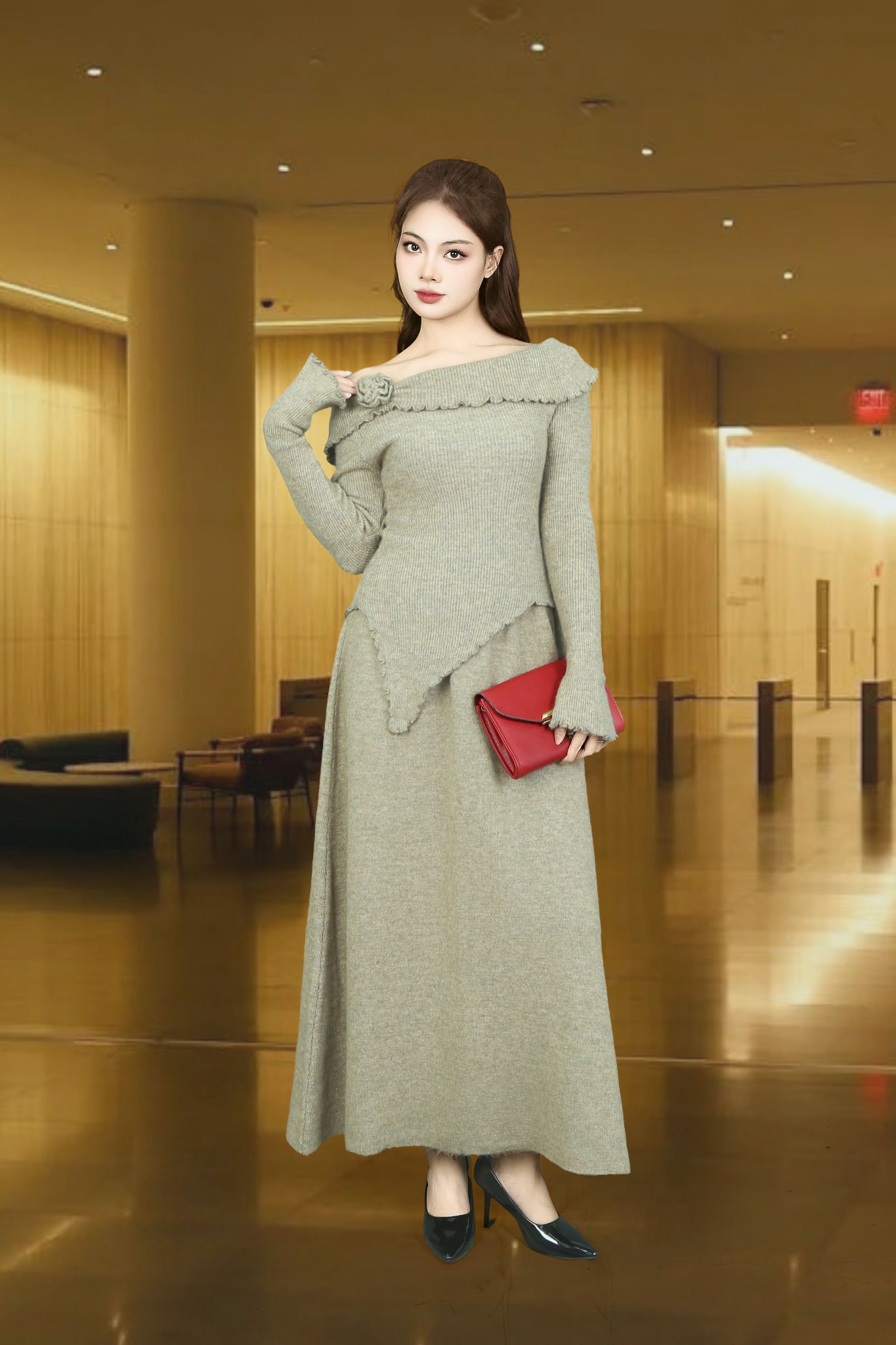 Bộ đầm len nâu áo trễ vai đính hoa vạt chéo nhọn chân bút chì dài