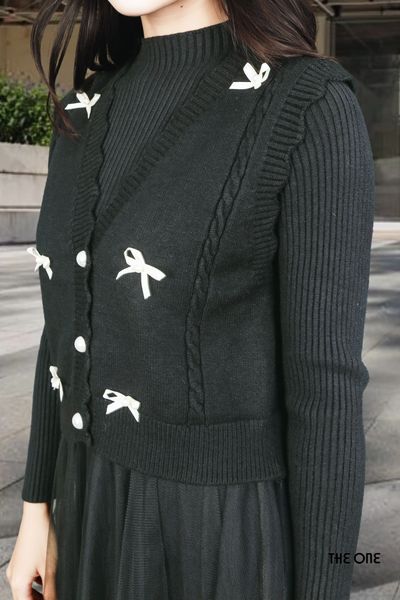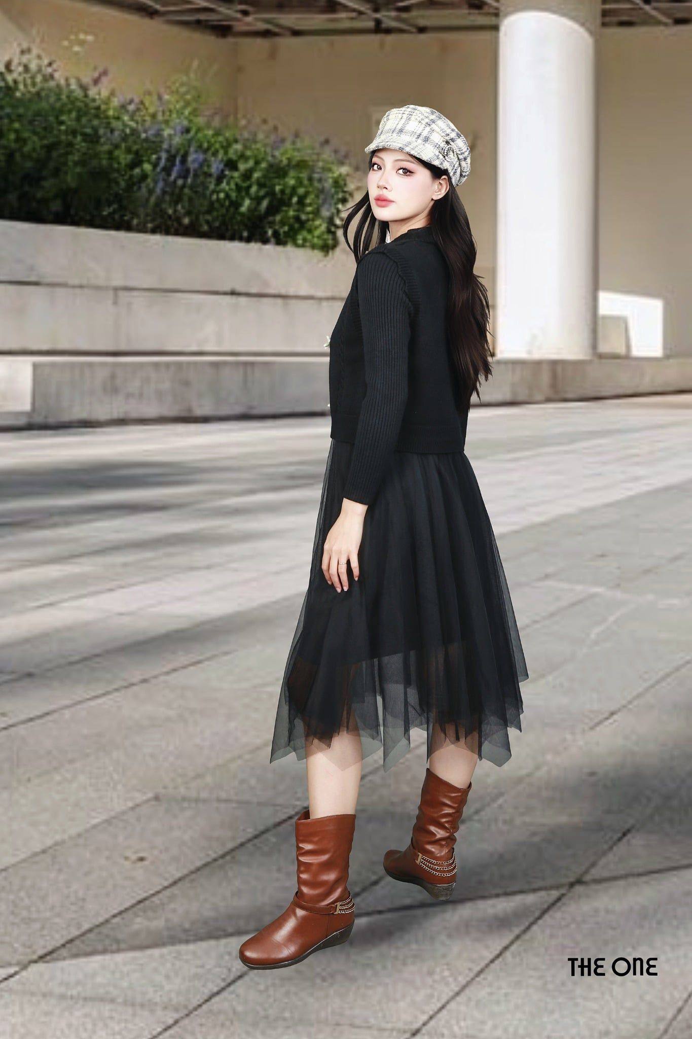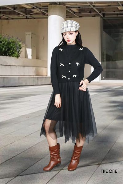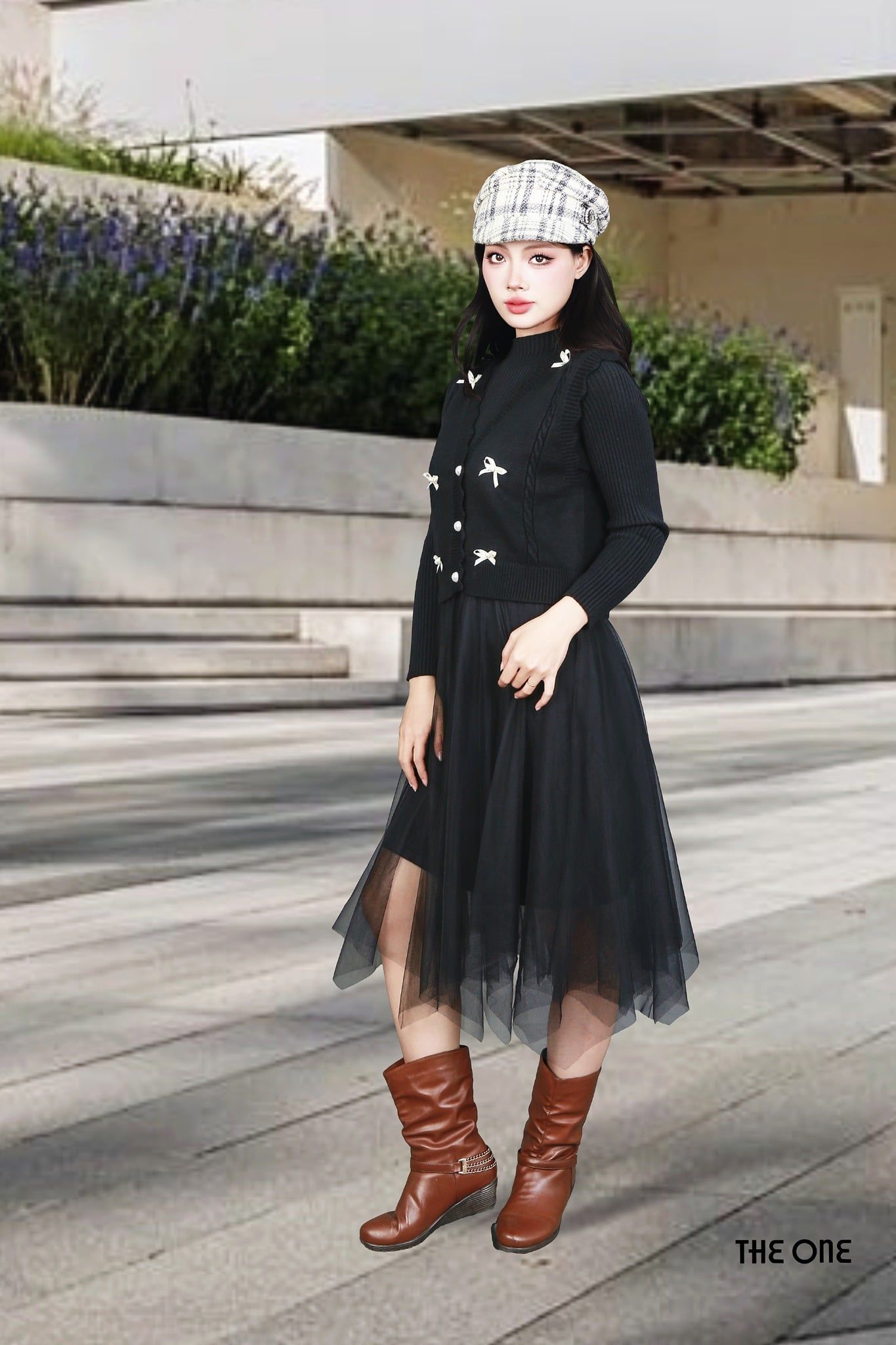 Bộ đầm len đen cổ 3cm tay dài chân xòe 2 lớp áo gile đính nơ
