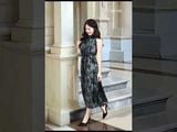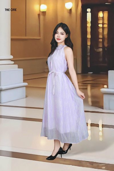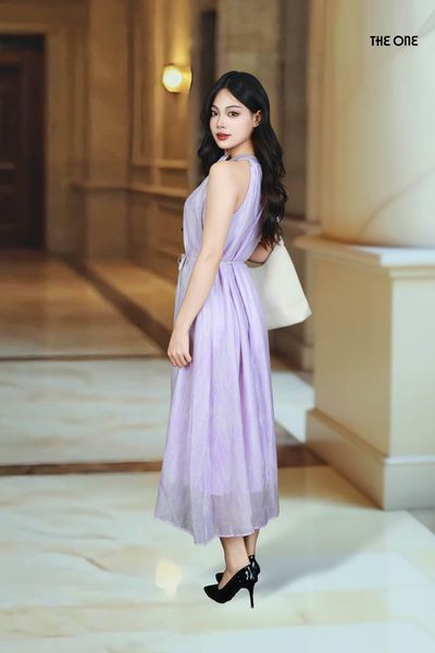 Đầm 2 lớp Maxi sát nách tơ Nhật tím loang đính đá hoa cài dây đai