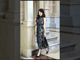 Đầm 2 lớp Maxi sát nách tơ Nhật vàng nâu đính đá hoa cài dây đai