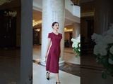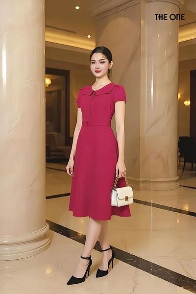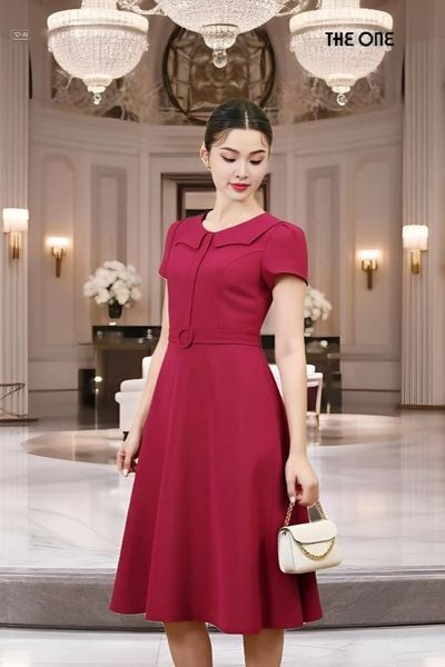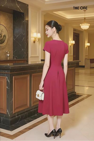 Đầm 1 lớp tay cộc đũi hồng tím đai eo dáng dài