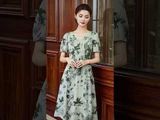 Đầm 2 lớp tay cộc đũi cao cấp hình rêu be cổ tim chân xếp ly khuy trang trí