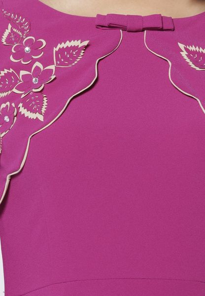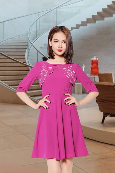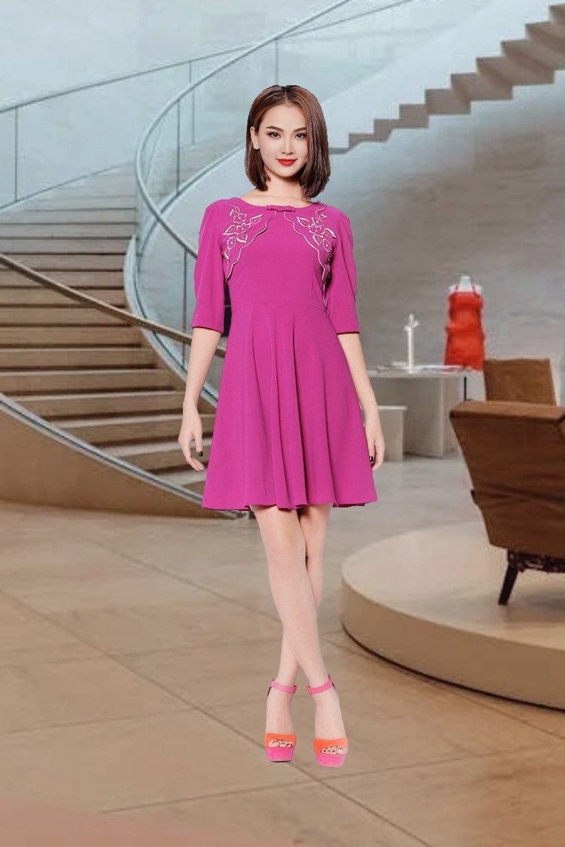 Đầm mango hồng tím tay lỡ dáng xòe thêu hoa 2 vai