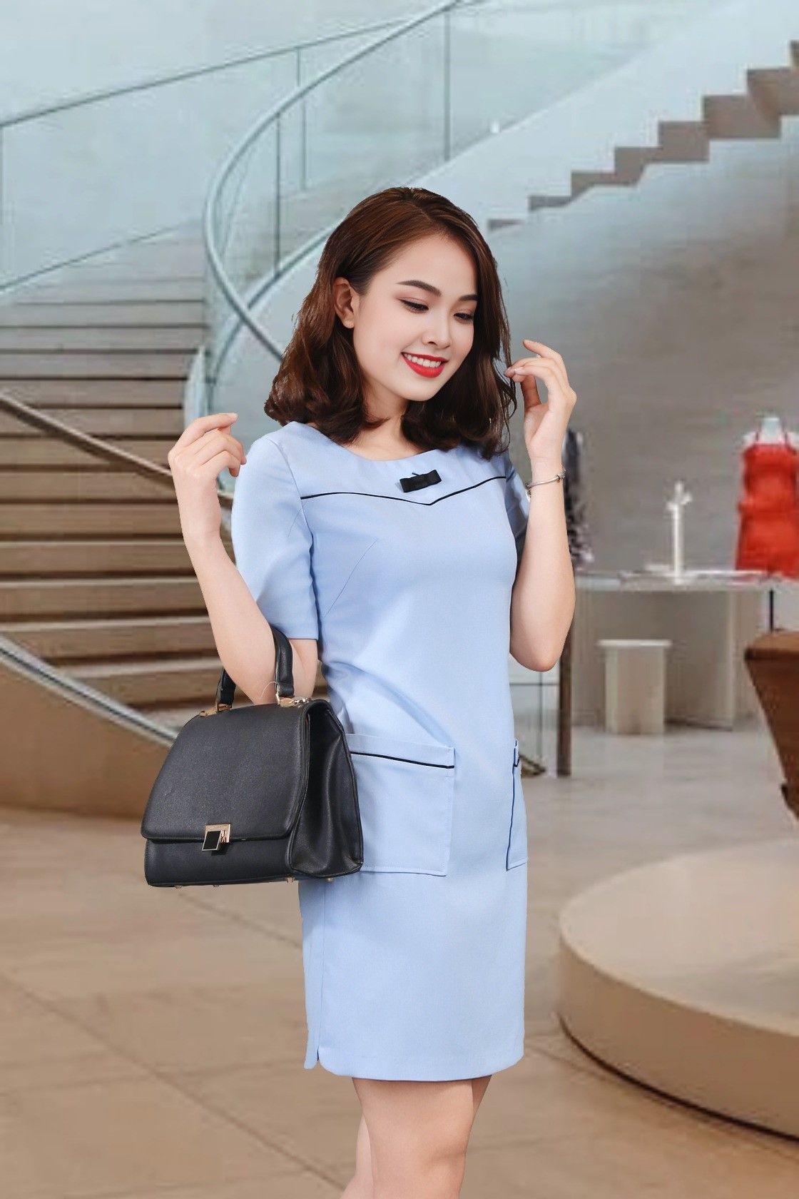 Đầm 1 lớp tay lỡ xước xanh nhạt dáng suông nơ ngực 2 túi ốp