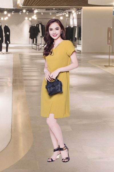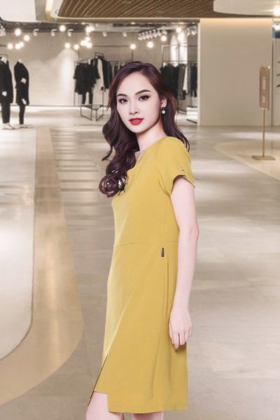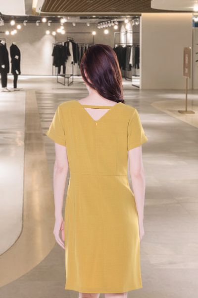 Đầm 1 lớp tay cộc gân vàng chanh dáng ôm tà trước cổ dây xỏ khuyên