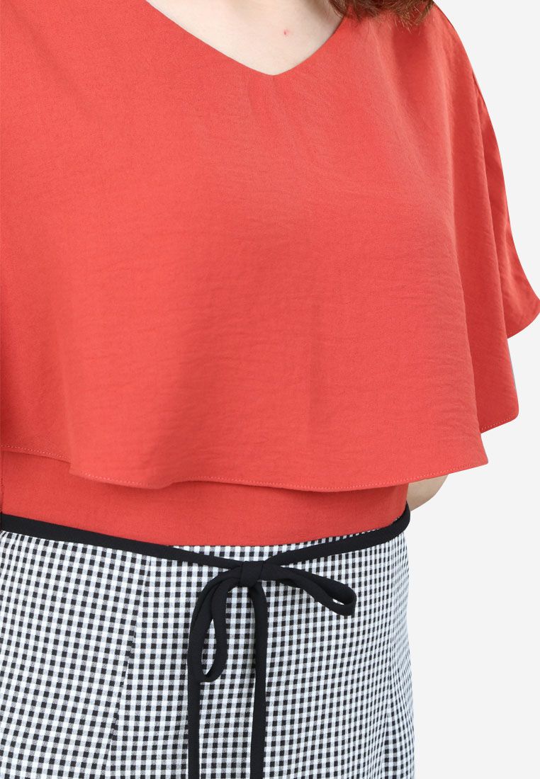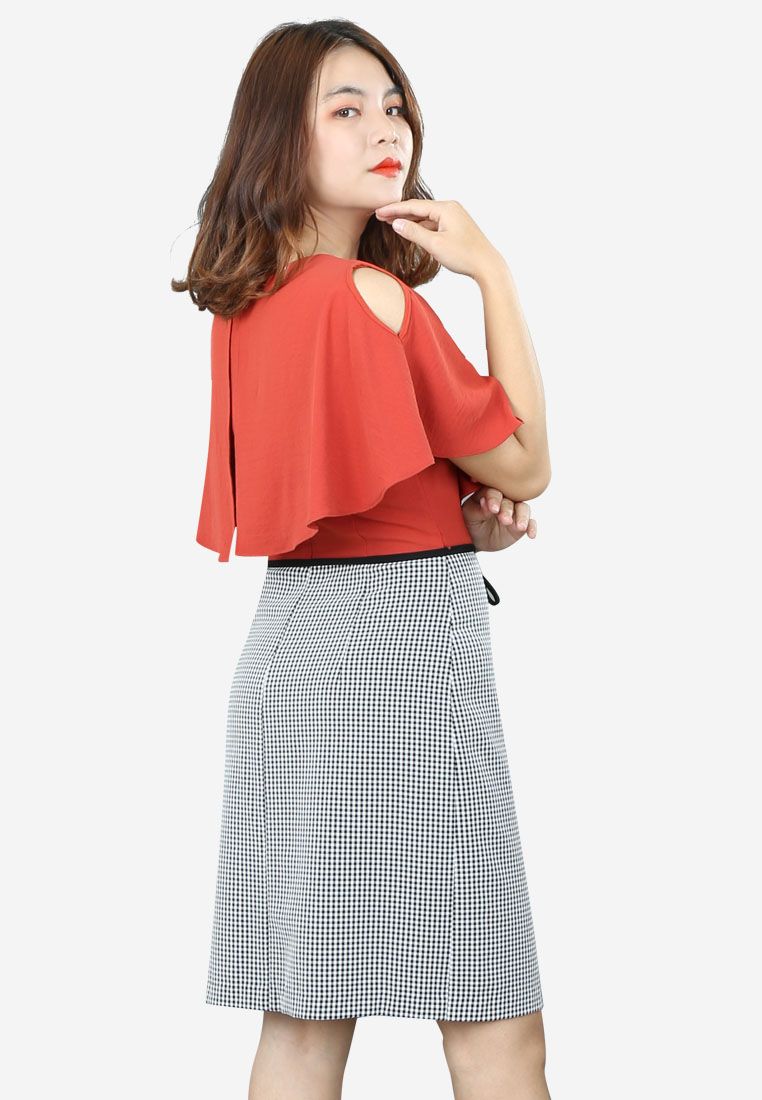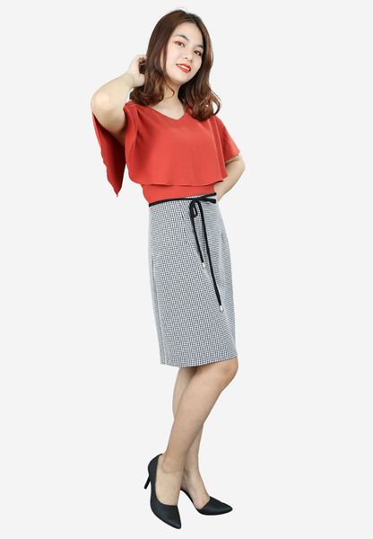 Đầm 1 lớp tay cánh dơi lỡ nhăn cam phối caro đen trắng cổ tim dáng ôm dây nơ eo