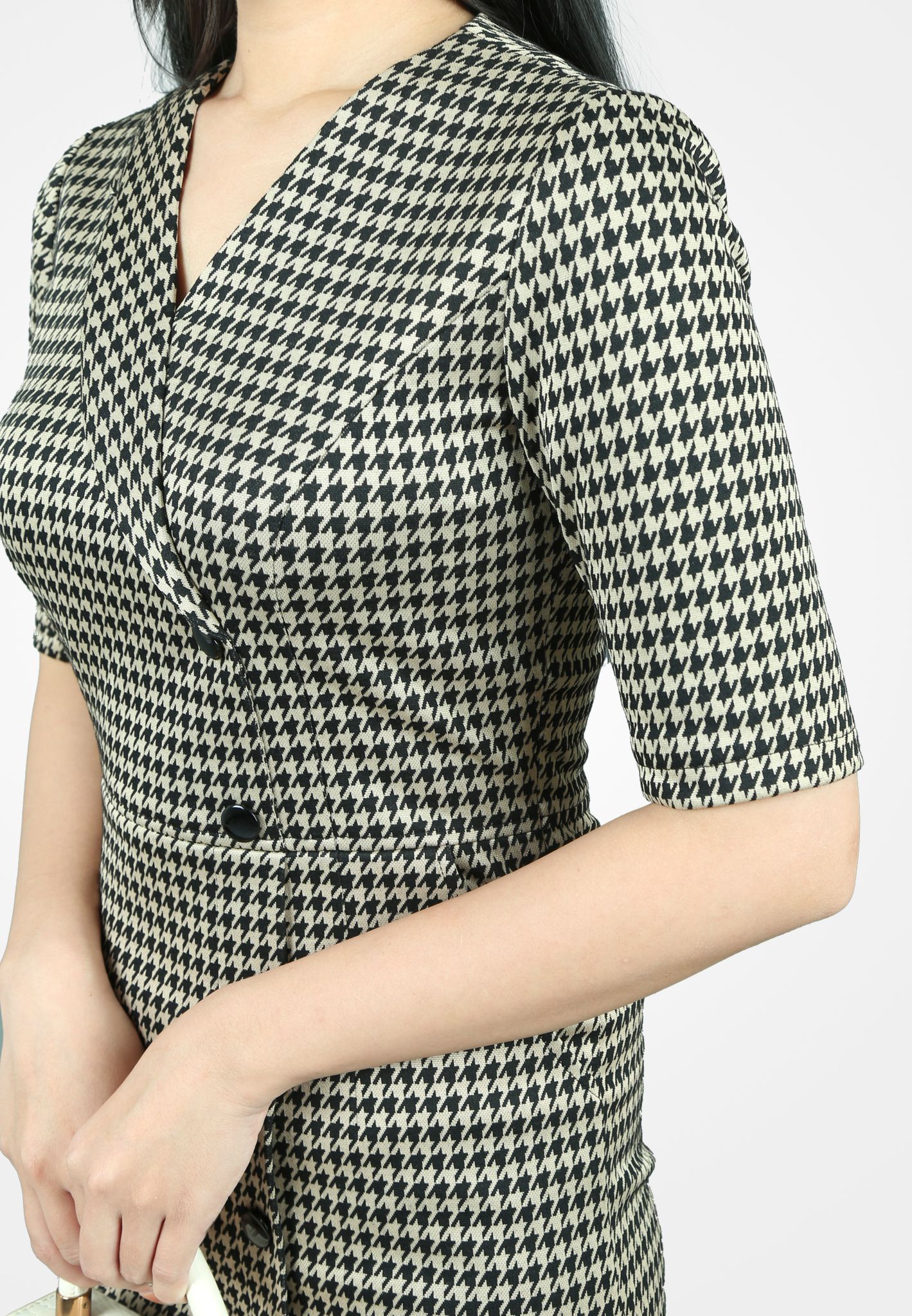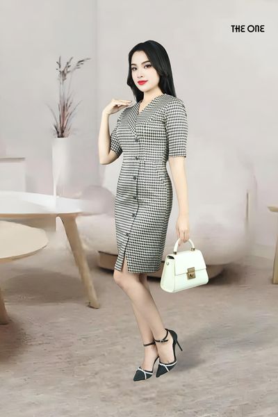 Đầm 1 lớp tay lỡ u mì nền be nâu răng ngựa đen cổ 2 ve 1 bên khuy trang trí đai eo