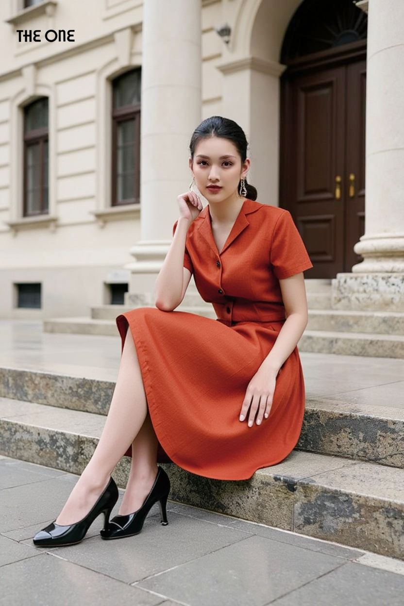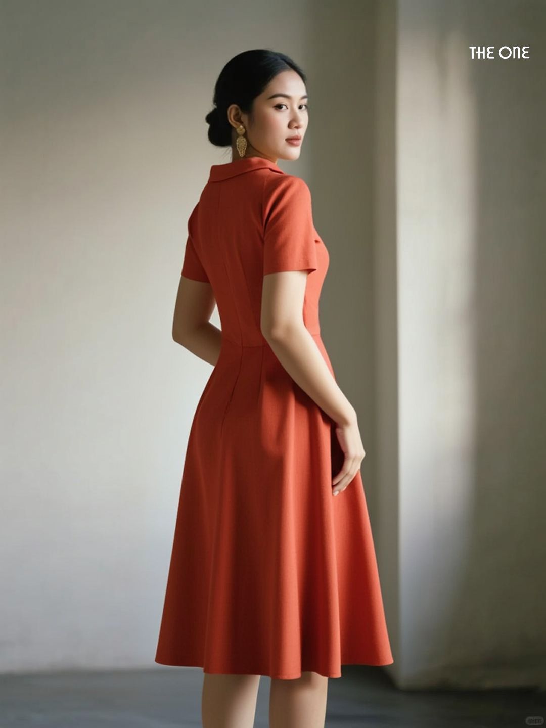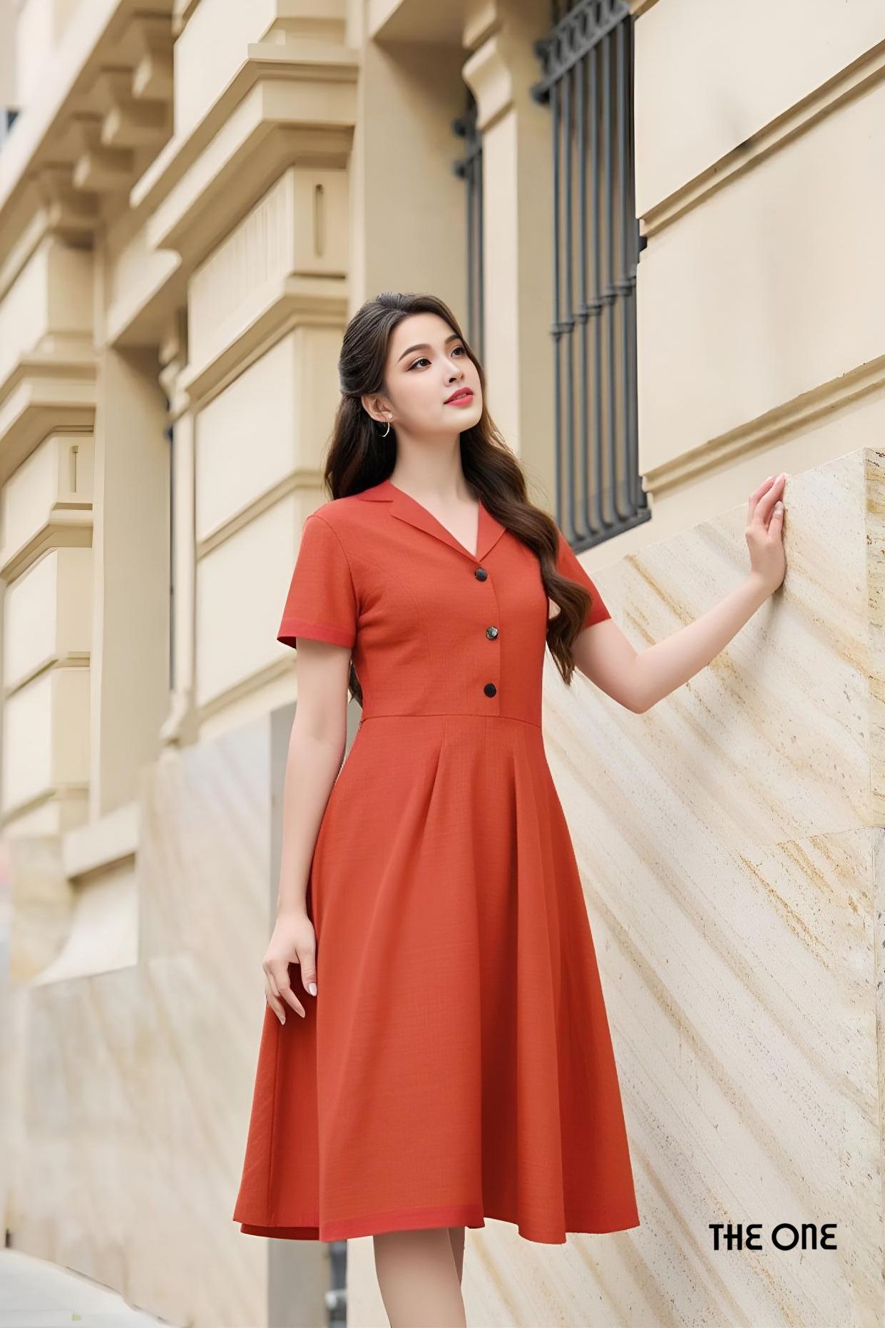 Đầm 2 lớp tay lỡ cộc xước bã trầu cổ 2 ve chân xếp xòe đính khuy
