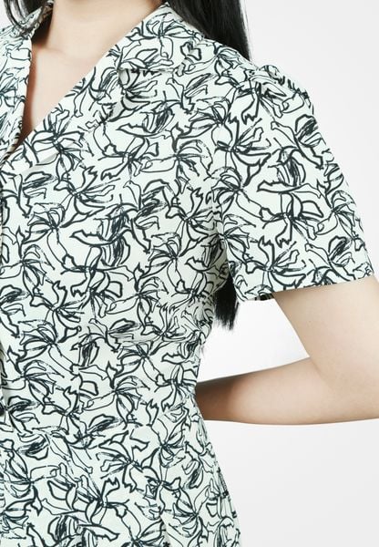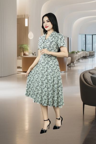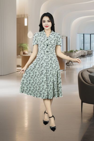 Đầm 2 lớp tay cộc lụa mịn be trắng hoa đen thưa cổ 2 ve chân xếp xòe tay nhún bồng đính khuy