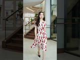 Đầm 2 lớp tay cộc lụa nhật hoa tím cổ 2 ve chân xếp xòe tay nhún bồng đính khuy