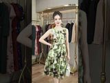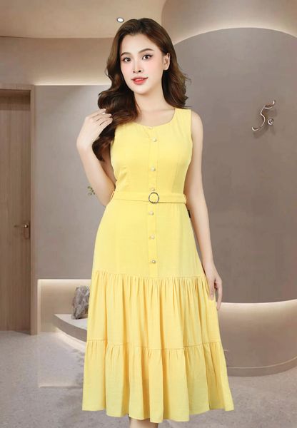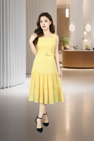 Đầm 2 lớp sát nách lụa vàng cổ tròn đai eo chân xòe xếp nhún