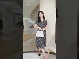 Đầm 2 lớp tay cộc lụa nhật đen hoa hồng trắng cổ 2 ve dáng xòe đai eo