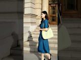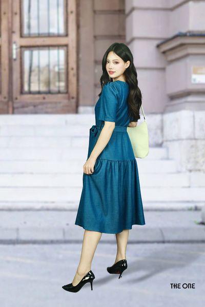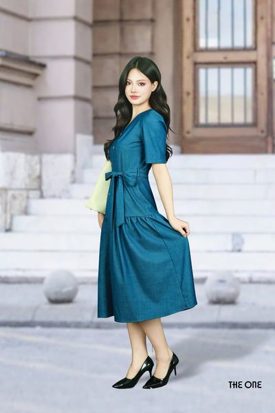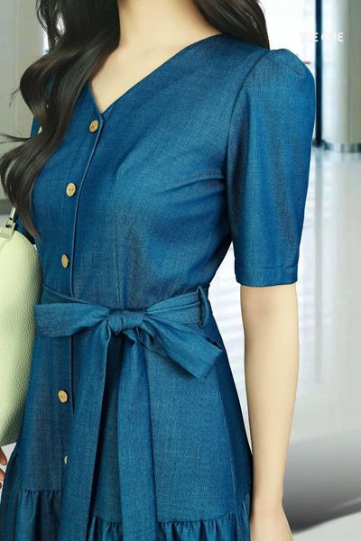 Đầm 2 lớp lụa tay lỡ bò xanh cổ tim đính khuy dây nơ chân xòe xếp nhún