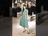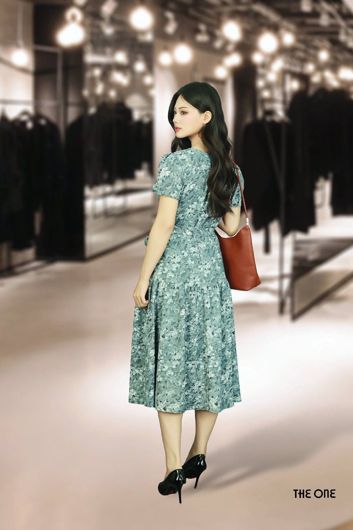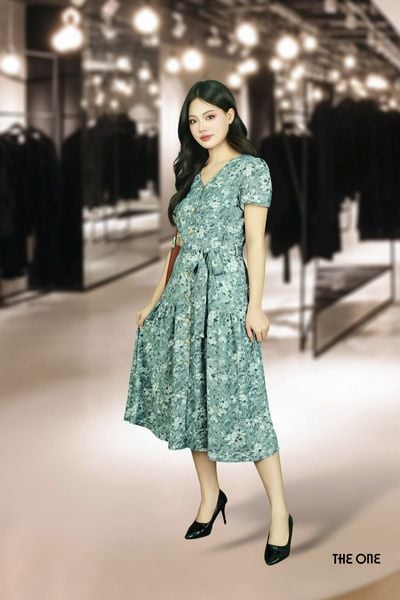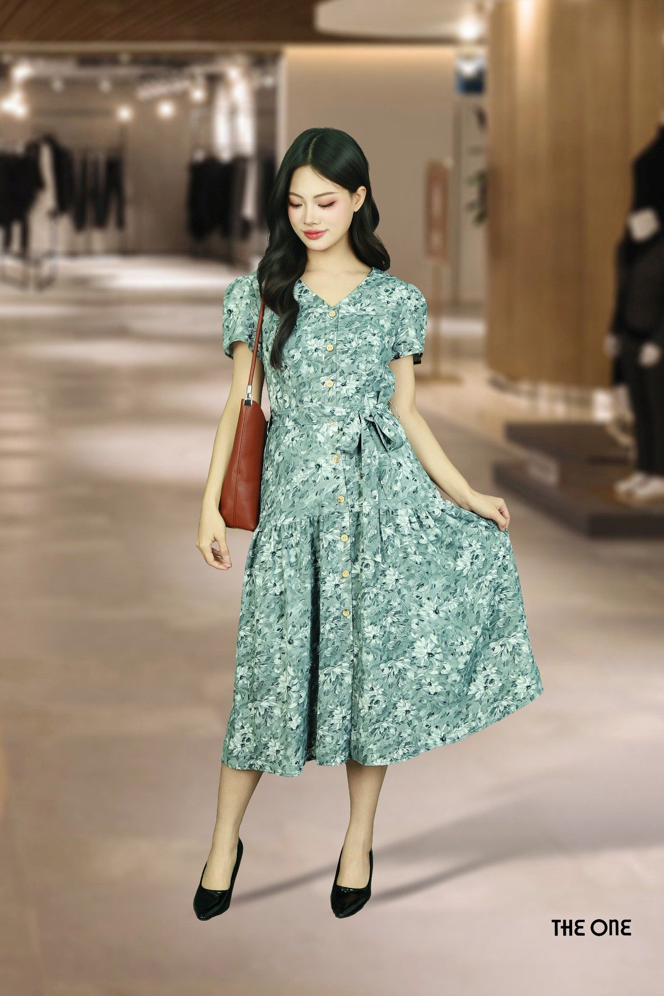 Đầm 2 lớp tay cộc lụa Hàn châu hoa ghi cổ tim đính khuy dây nơ chân xòe xếp nhún