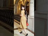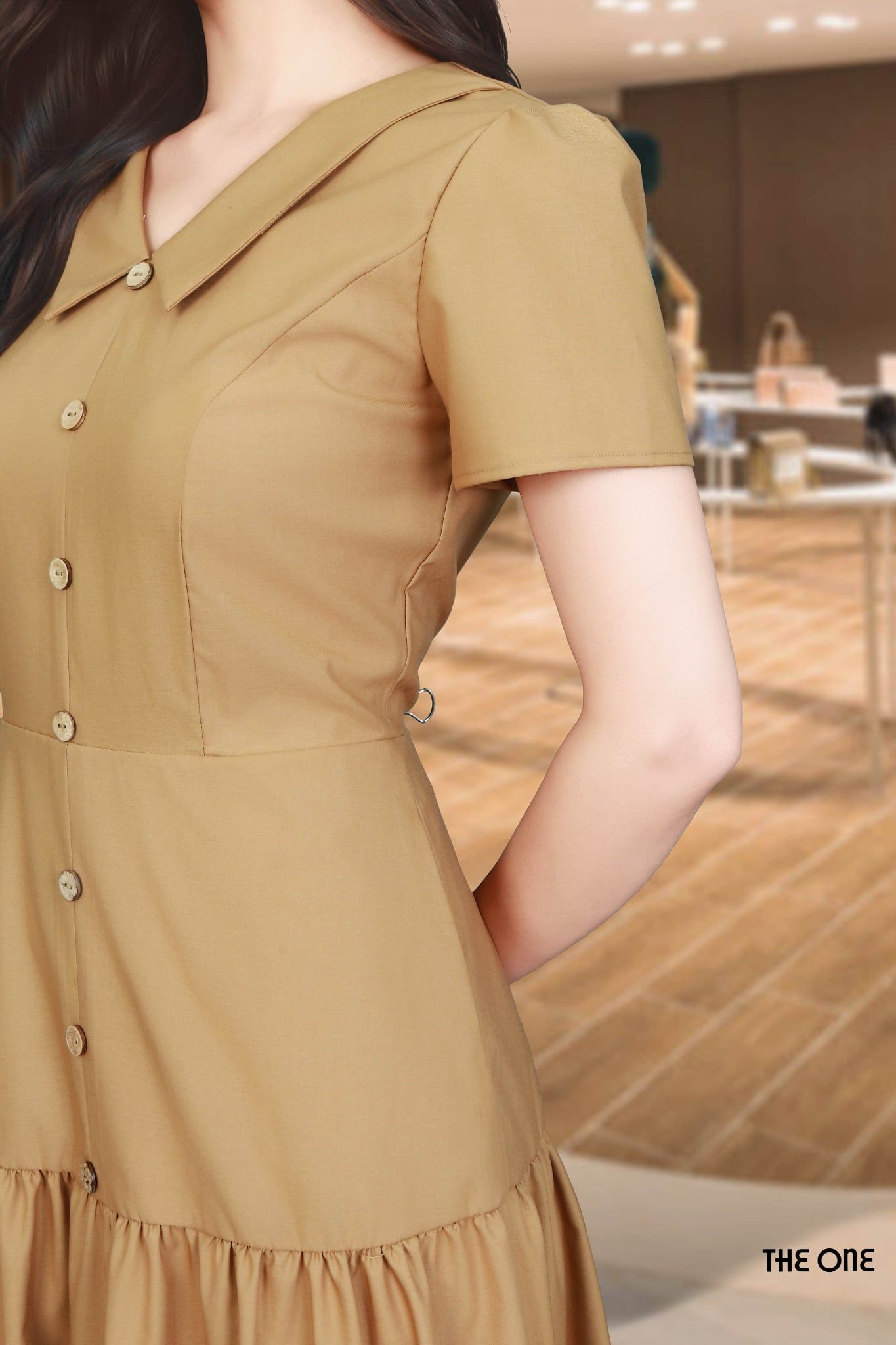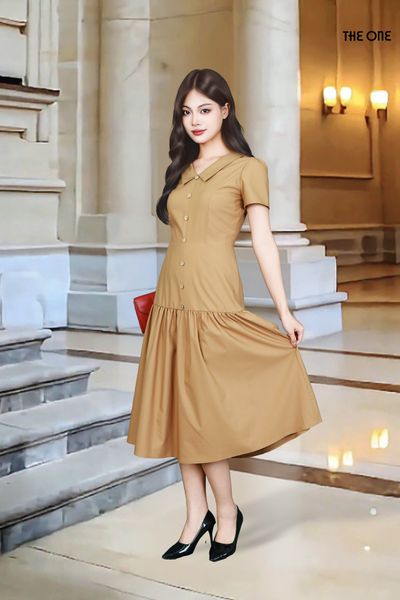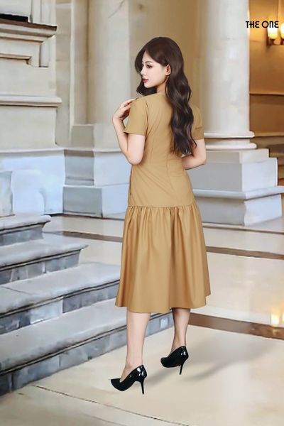 Đầm 2 lớp tay cộc xước giấy Hàn nâu cổ nam nằm chân xếp nhún đính khuy