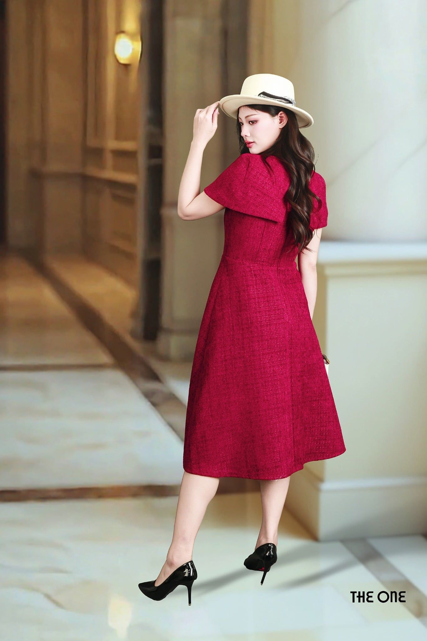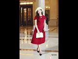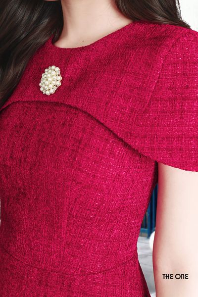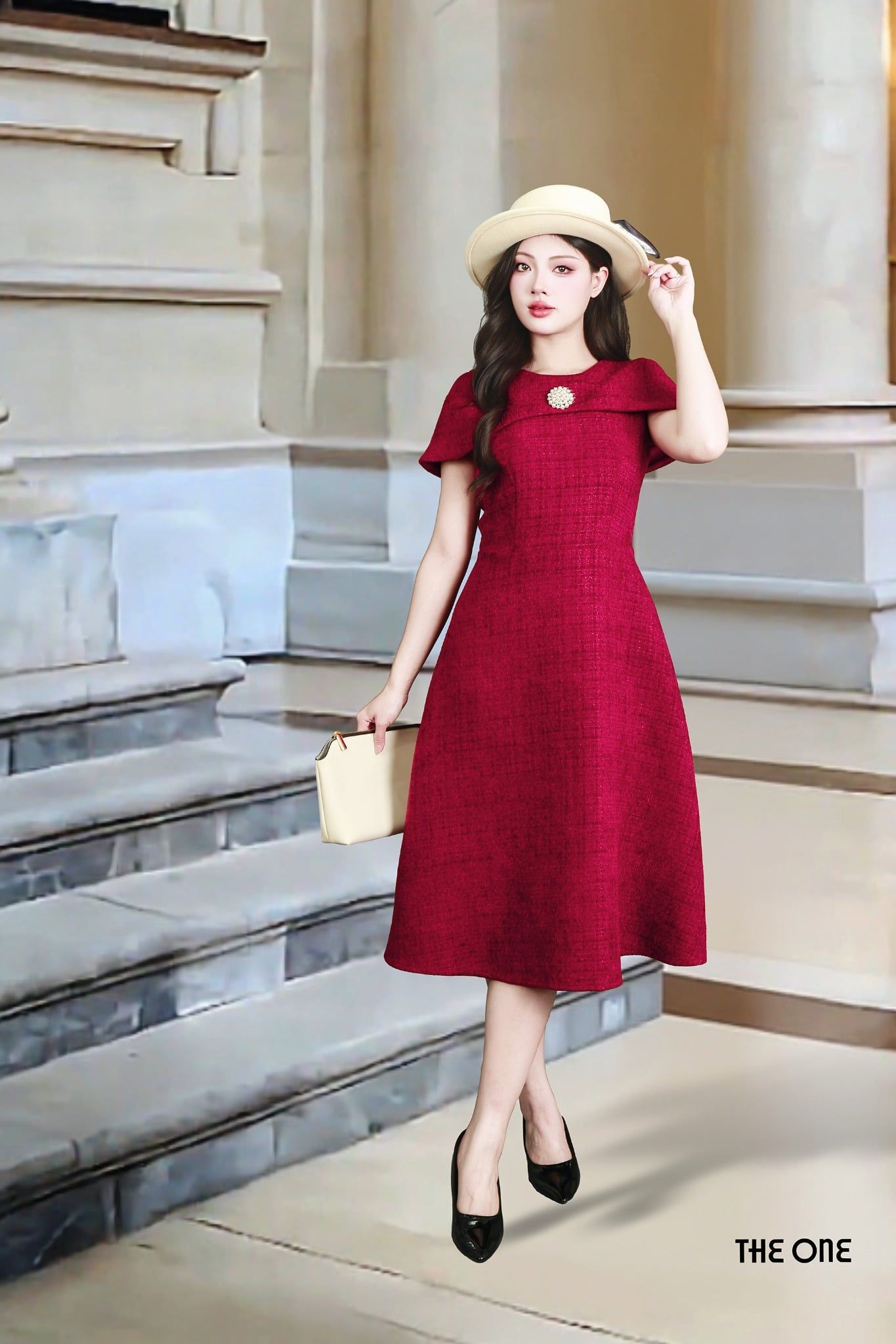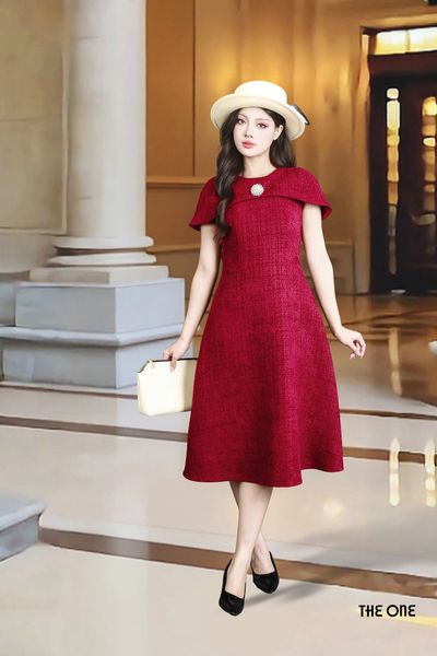 Đầm 2 lớp tay lỡ dạ text đỏ đô vai chờm cổ tròn đính trang trí
