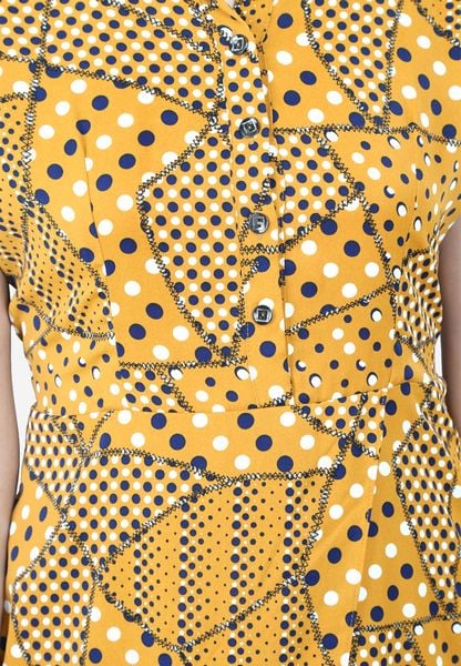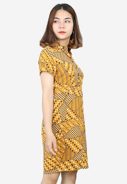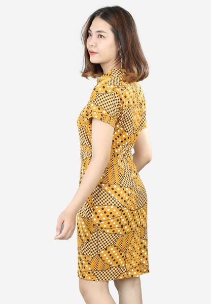 Đầm cổ đức tay cộc vạt chéo trước vải lụa lạnh hình vàng