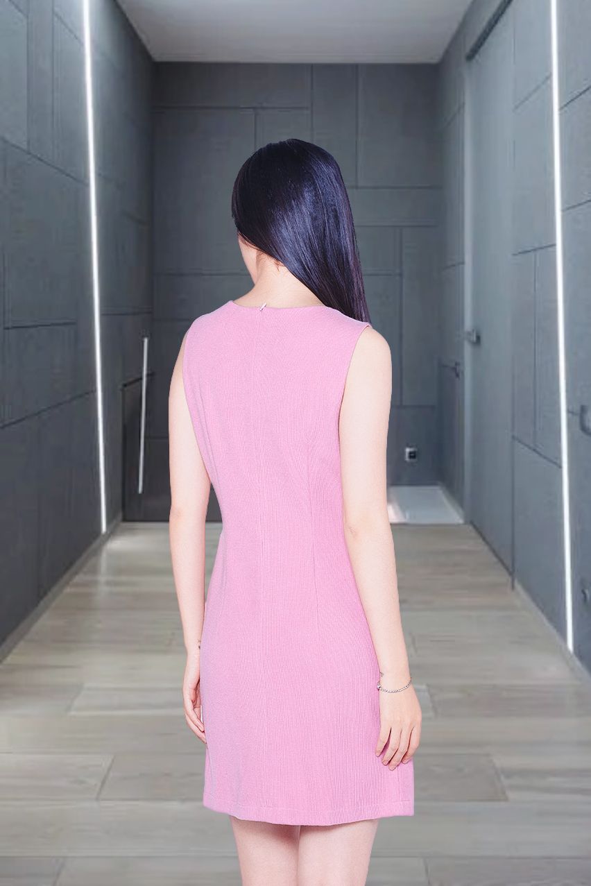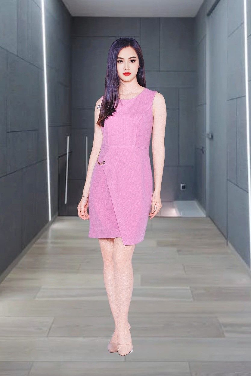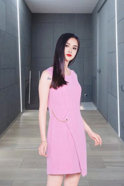 Đầm 2 lớp sát nách len hồng KT đáp tà thân dưới đột ô-rê dây xích