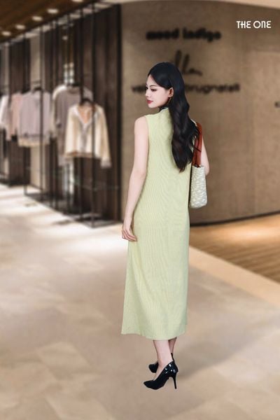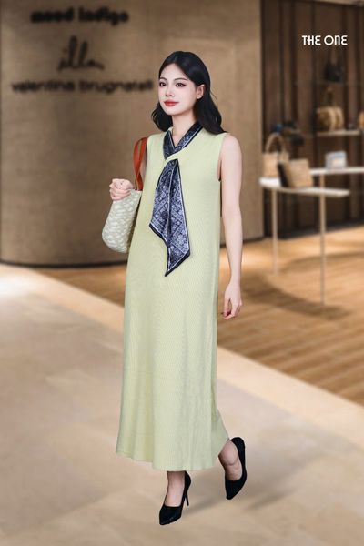 Đầm len tăm sát nách dáng dài vàng nhạt cổ V khăn lụa