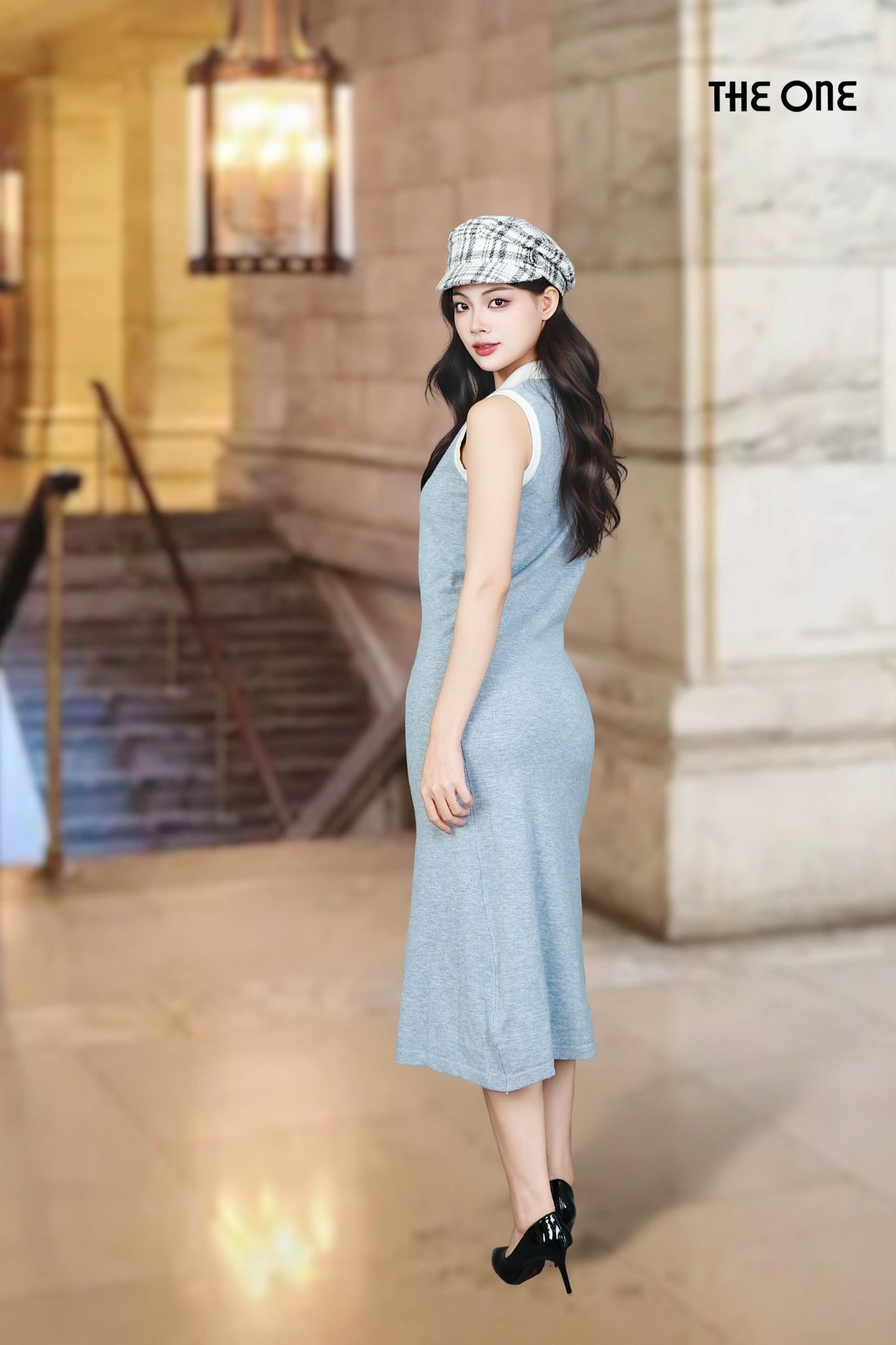 Đầm len dài sát nách ghi cổ bẻ đính khuy khăn lụa cổ và nách viền kem